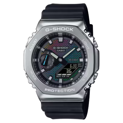 Rainbow vapor deposition reproduces the symbolic brick wall imagery in brilliant rainbow hues that shift and change depending on the light. The colorful design stays true to the origin of G-SHOCK with the spirit of toughness it takes to overcome barriers and constantly push limits.