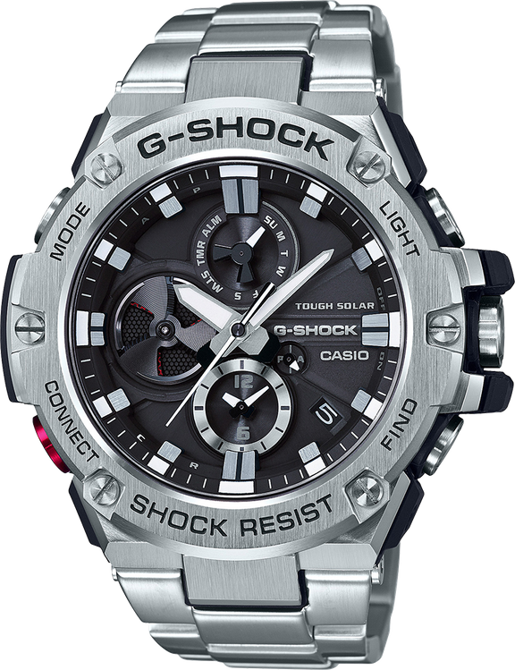 G-SHOCK offers the first G-STEEL lineup models featuring chronograph performance in analog format. The dial at 9 o’clock has a multi-functional rotating disk that is cut to resemble the thick blades of a jet engine. These watches are equipped with Bluetooth® that lets them connect with a smartphone at the press of a button, and acquire time information from an internet time server. The result is accurate timekeeping no matter where in the world you happen to be. Other functions include Tough Solar in combination with CASIO original power saving technology for a stable supply of power, high brightness LED light illumination, and dual dial World Time. The GST-B100D comes with a simple stainless steel band.