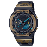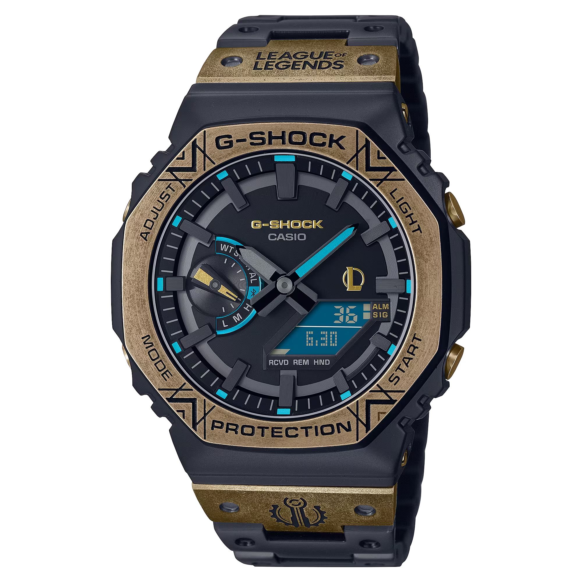We begin with the GM-B2100 full-metal analog timepiece and feature the magical Hextech™ technology so important to the Runeterra world in League of Legends. The bezel and part of the band are finished with initial ion plating in a gold color, followed by black, which is then partially removed to create a worn, aged look.