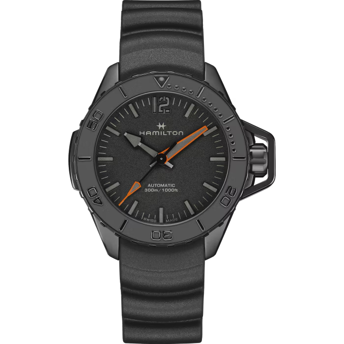 With an intrepid new look, the Khaki Navy Frogman Automatic is Hamilton’s most technically capable maritime-ready watch. Engineered for accuracy, legibility and endurance, the precision instrument brings the unfathomable power of the ocean to the wrist with a uniquely shaped crown protector and wave-look tactical rubber strap.