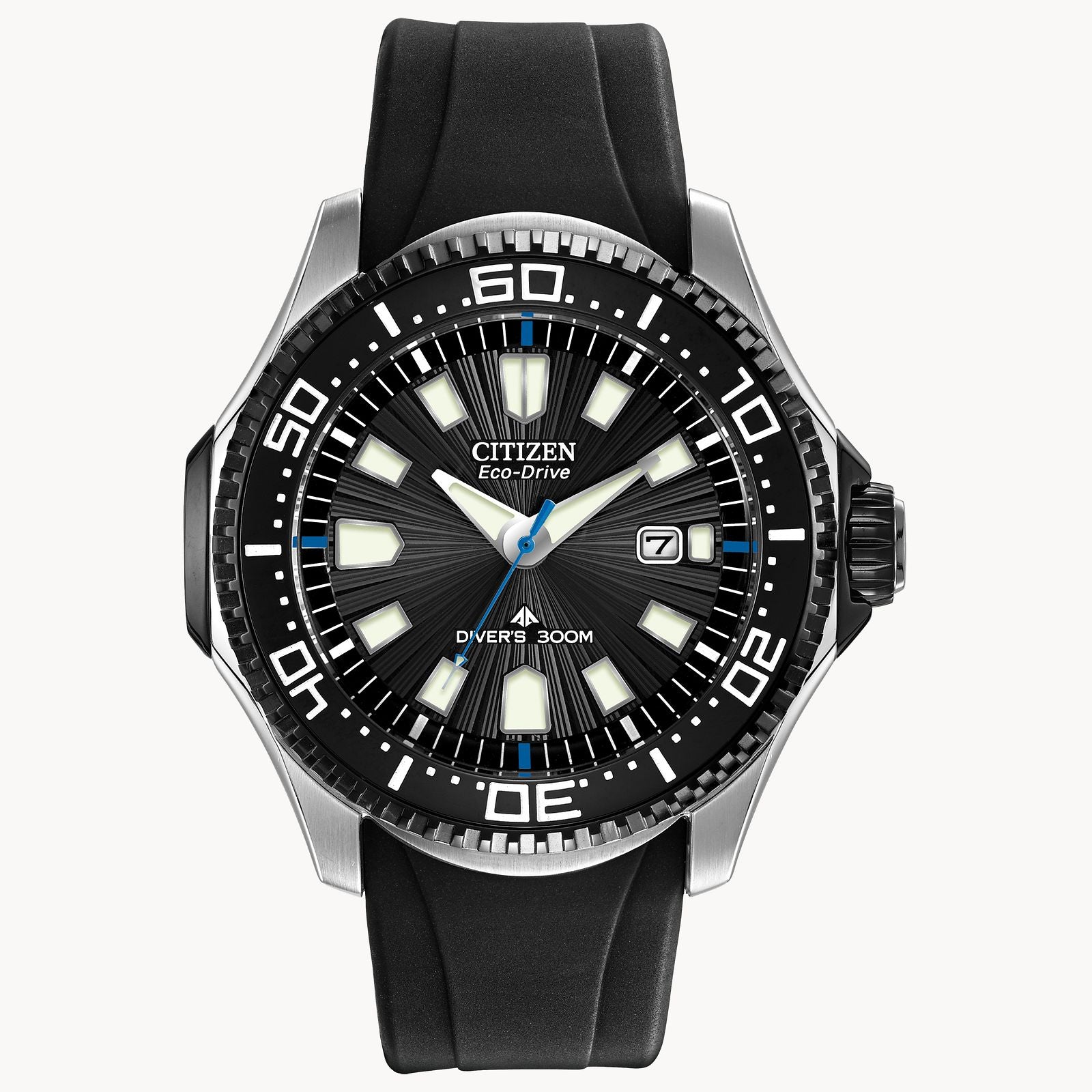 Make a splash with this ISO-certified watch from the Citizen Eco-Drive Promaster Diver Collection. It is fueled by light and never needs a battery, so you'll never need to open your caseback or compromise your dive again. One-way rotating elapsed-time bezel, screw-back case and screw-down crown and non-reflective crystal with poly strap. Featuring our Eco-Drive technology – powered by light, any light. Never needs a battery. Caliber number E168.