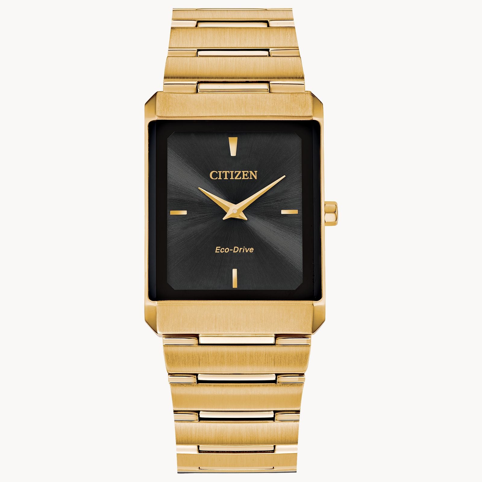 The Stiletto Tank from Citizen is a sleek timepiece that complements every outfit it is worn with. The gold plated stainless steel band and square case is just 5.06mm (+/- .25mm) thick. The Eco-Drive powered watch has a lay-flat clasp, and was intentionally designed as a unisex timepiece that will be comfortable no matter what wrist it rests on.