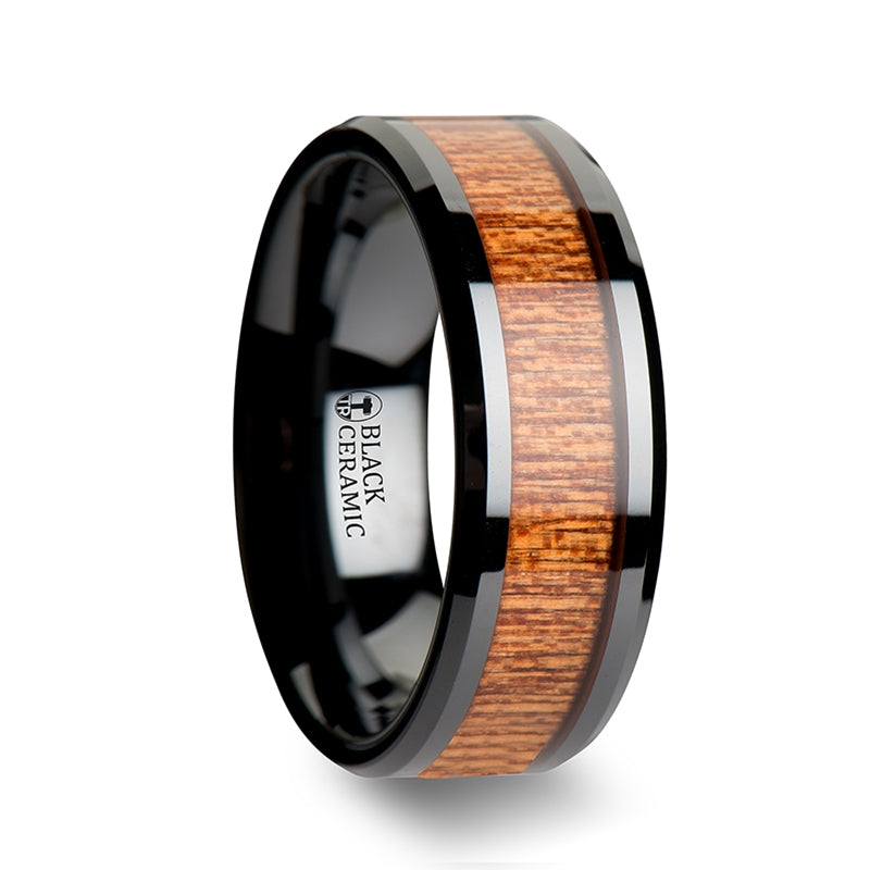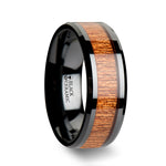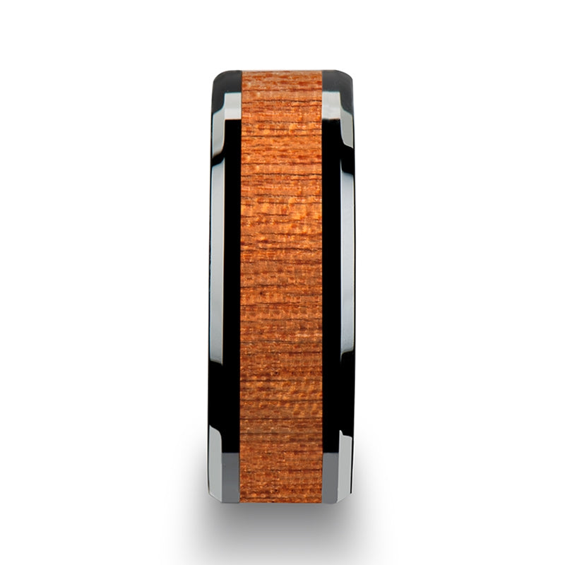 Black Ceramic Wedding Band with Polished Bevels and African Sapele Wood Inlay