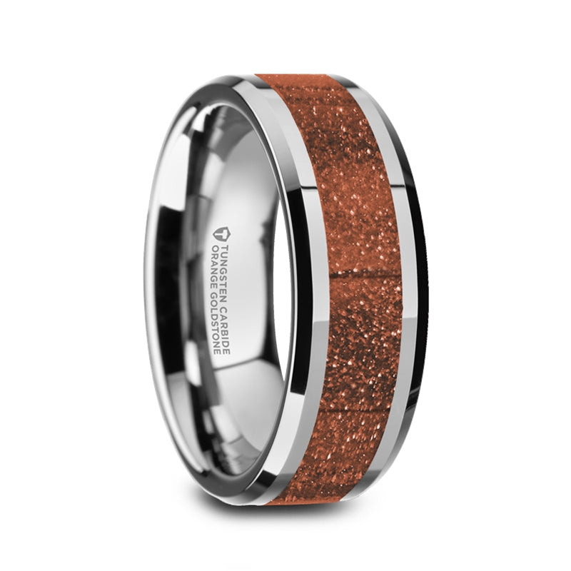 Men’s Polished Finish Beveled Edges Tungsten Wedding Band with Orange Goldstone Inlay