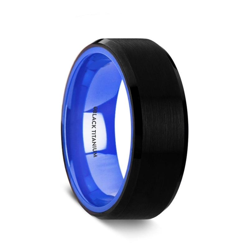 Beveled Edges Black Titanium Ring with Brushed Center and Vibrant Blue Inside