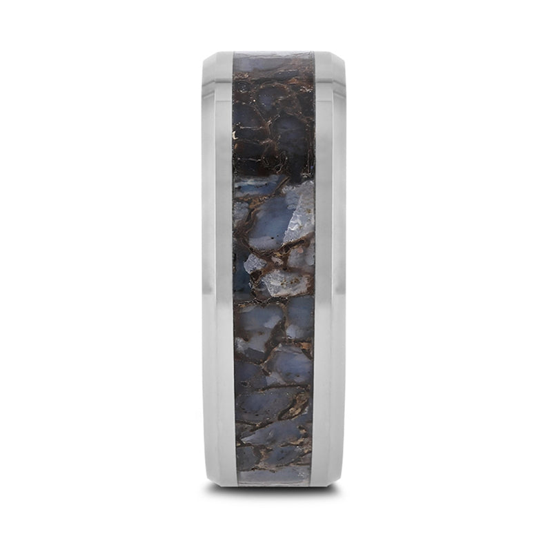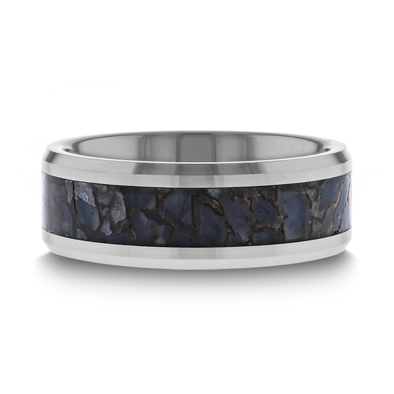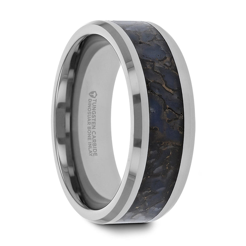 Blue Dinosaur Bone Inlaid Tungsten Carbide Beveled Edged Ring