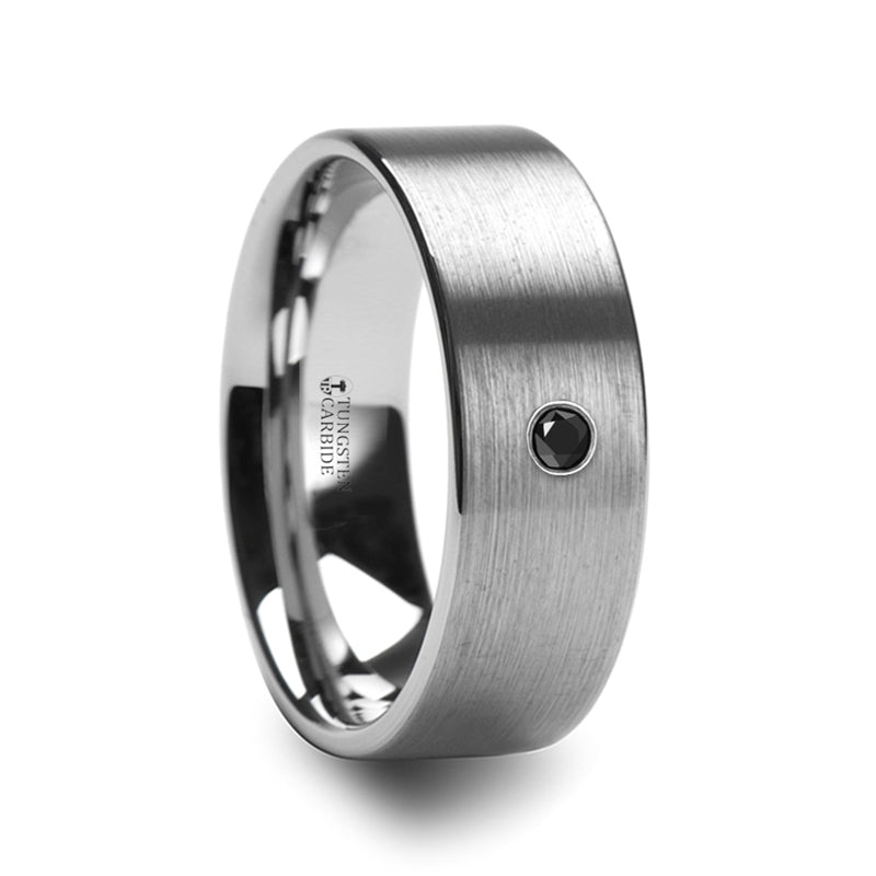 Flat Brushed Tungsten Men’s Wedding Ring with Black Diamond