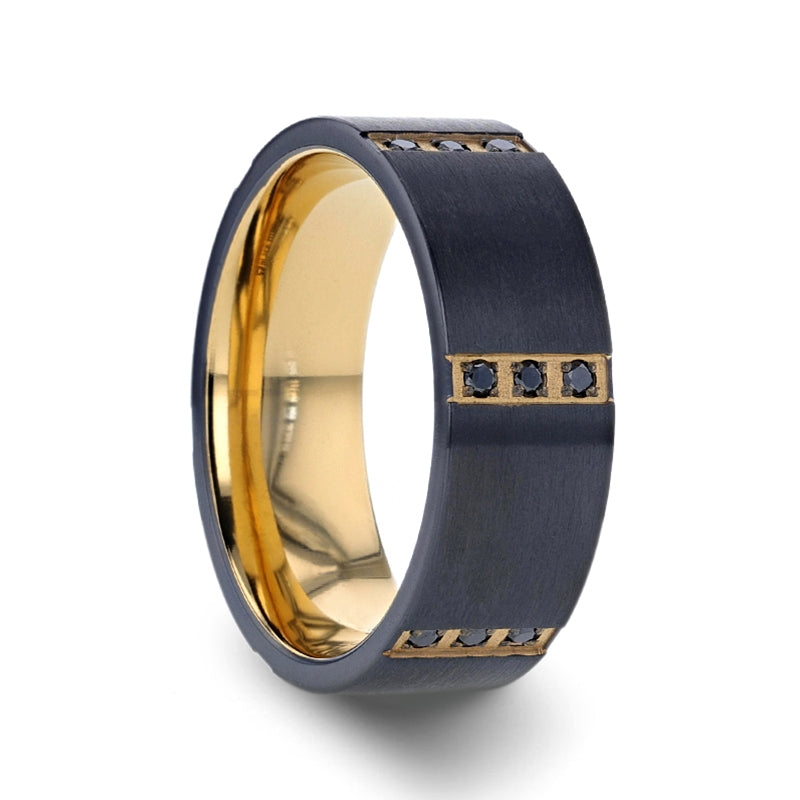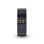 Flat Brushed Black Titanium Ring with Gold Plated Inside and 6 Gold Plated Stainless Steel Bezels with Triple Black Diamond Setting. 8mm width