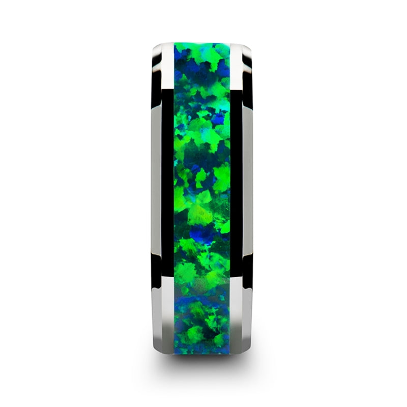 Tungsten Wedding Band with Beveled Edges and Green Blue Opal Inlay