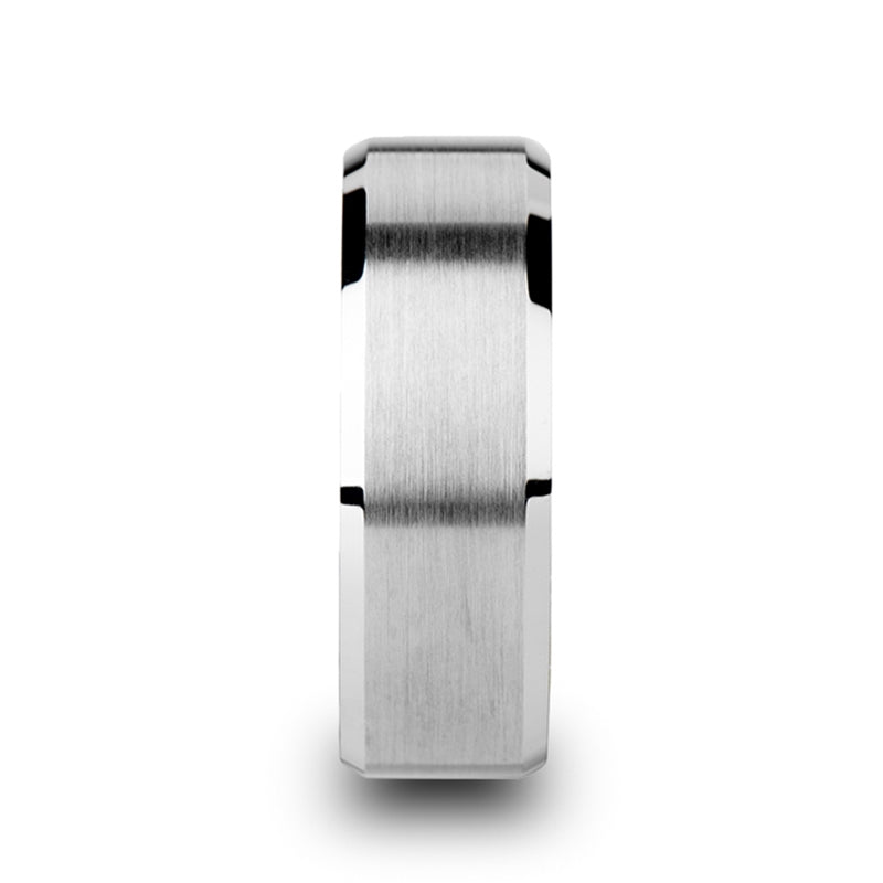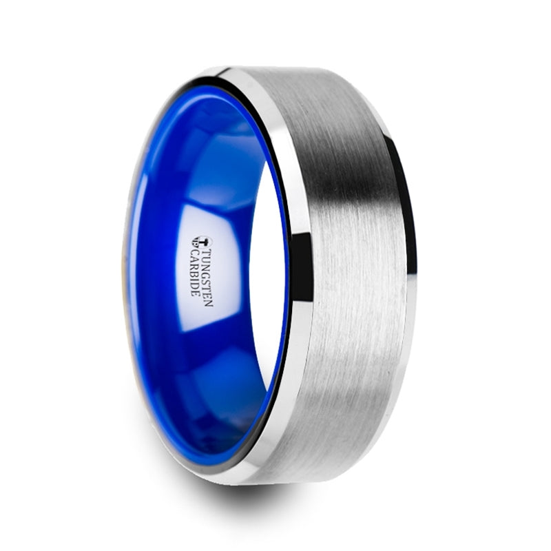 Tungsten Comfort Fit Wedding Band with Brush Center Bright Bevels and Deep Blue inside color
