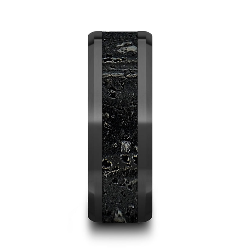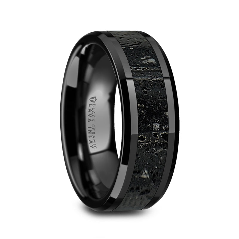 Men’s Polished Black Ceramic Wedding Band with Black & Gray Lava Rock Stone Inlay & Polished Beveled Edges. 8mm width