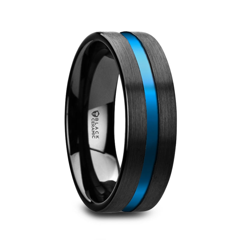 Flat Brushed Finish Black Ceramic Men’s Wedding Ring with Blue Grooved Center