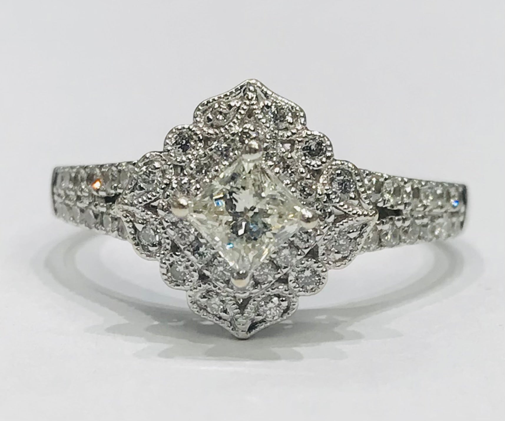 14k white gold & natual diamond vintage inspried halo ring. Set with 1 carat total weight of diamonds, 1/2 carat princess cut diamond center.