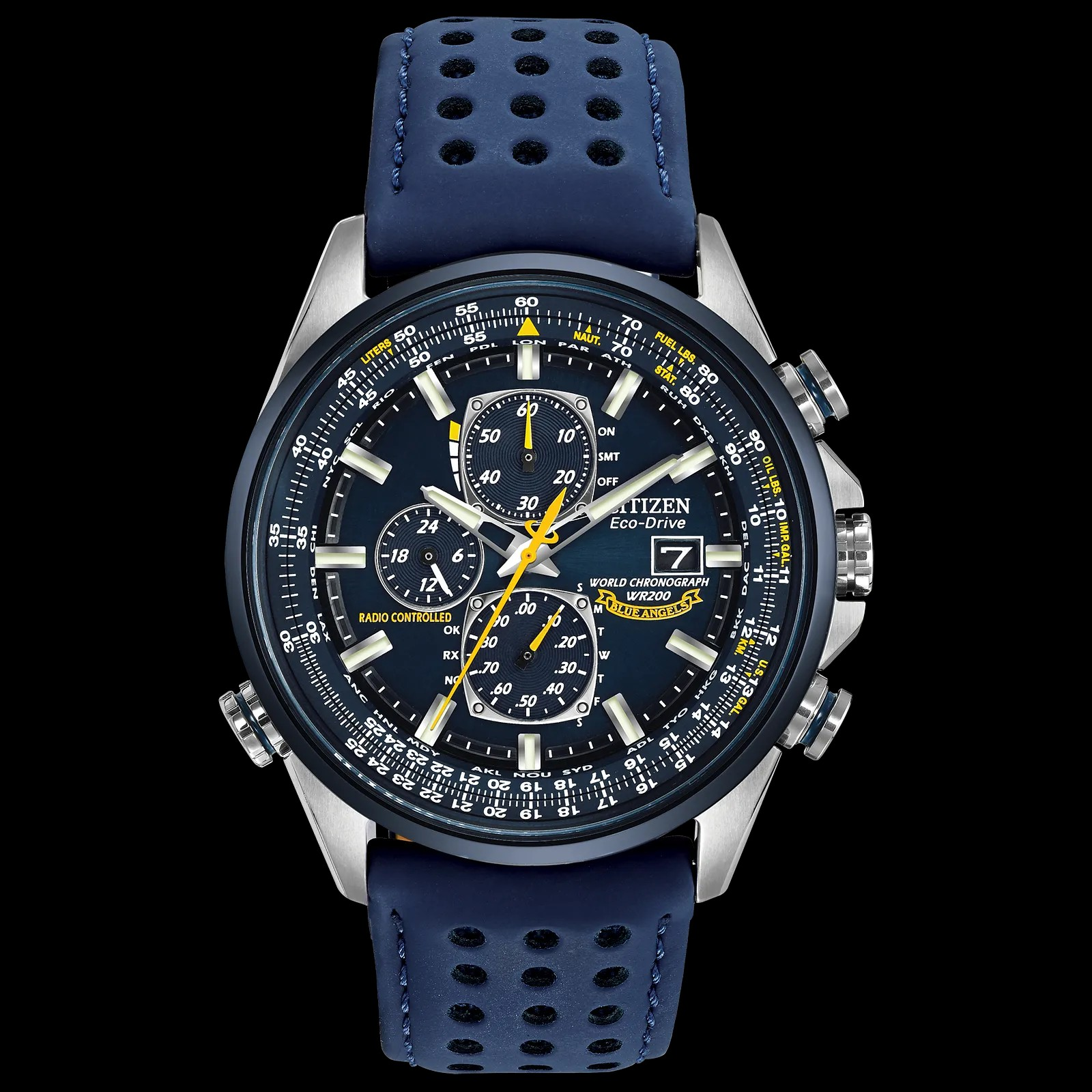 Citizen Eco-Drive Radio-Controlled Chronograph World Timer; Blue Angels edition with caseback insignia. Atomic time in 26 world cities; radio-controlled accuracy in 5 zones. 1/20 second chrono up to 60 minutes, perpetual calendar, 12/24 hour time, power reserve, non-reflective sapphire crystal. Stainless steel, blue ion plating, leather strap. Featuring our Eco-Drive technology – powered by light, any light. Never needs a battery. Caliber number H800.