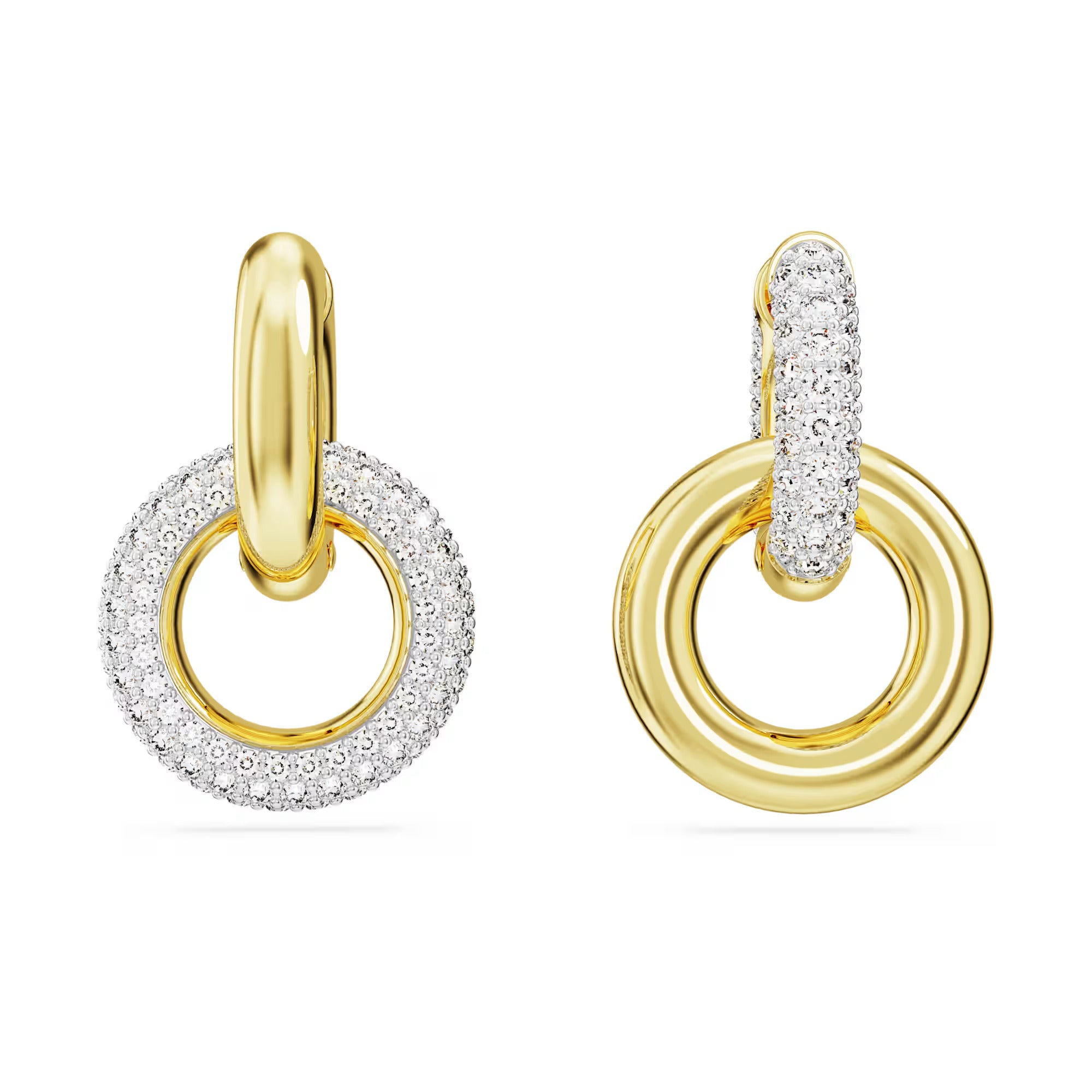These Dextera interlinked hoop earrings feature two gold-tone plated tubular rings, one with all-over pavé. To add an asymmetrical touch, the positioning of the rings is different on each piece, and for added versatility you can detach the second hoop for a single hoop style.