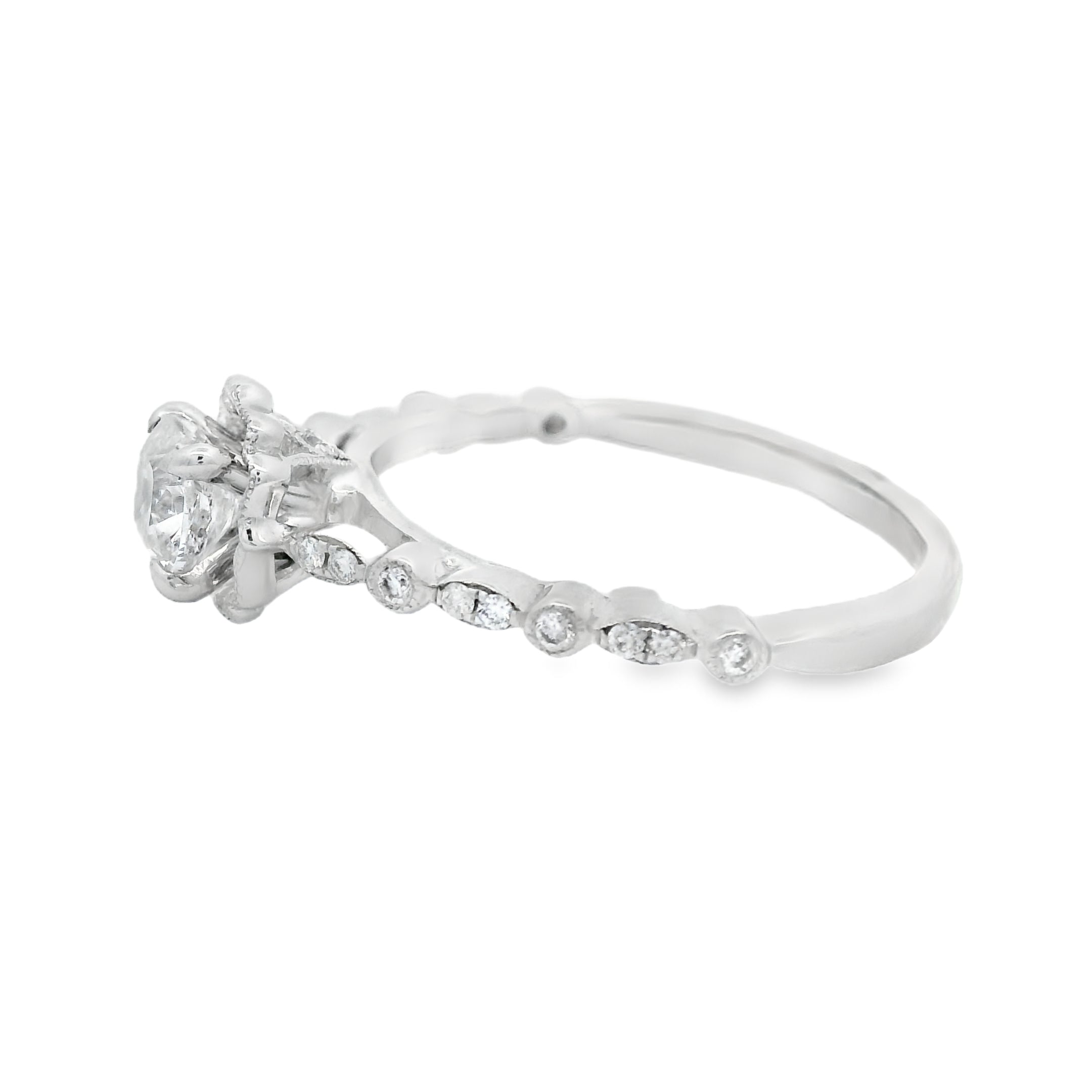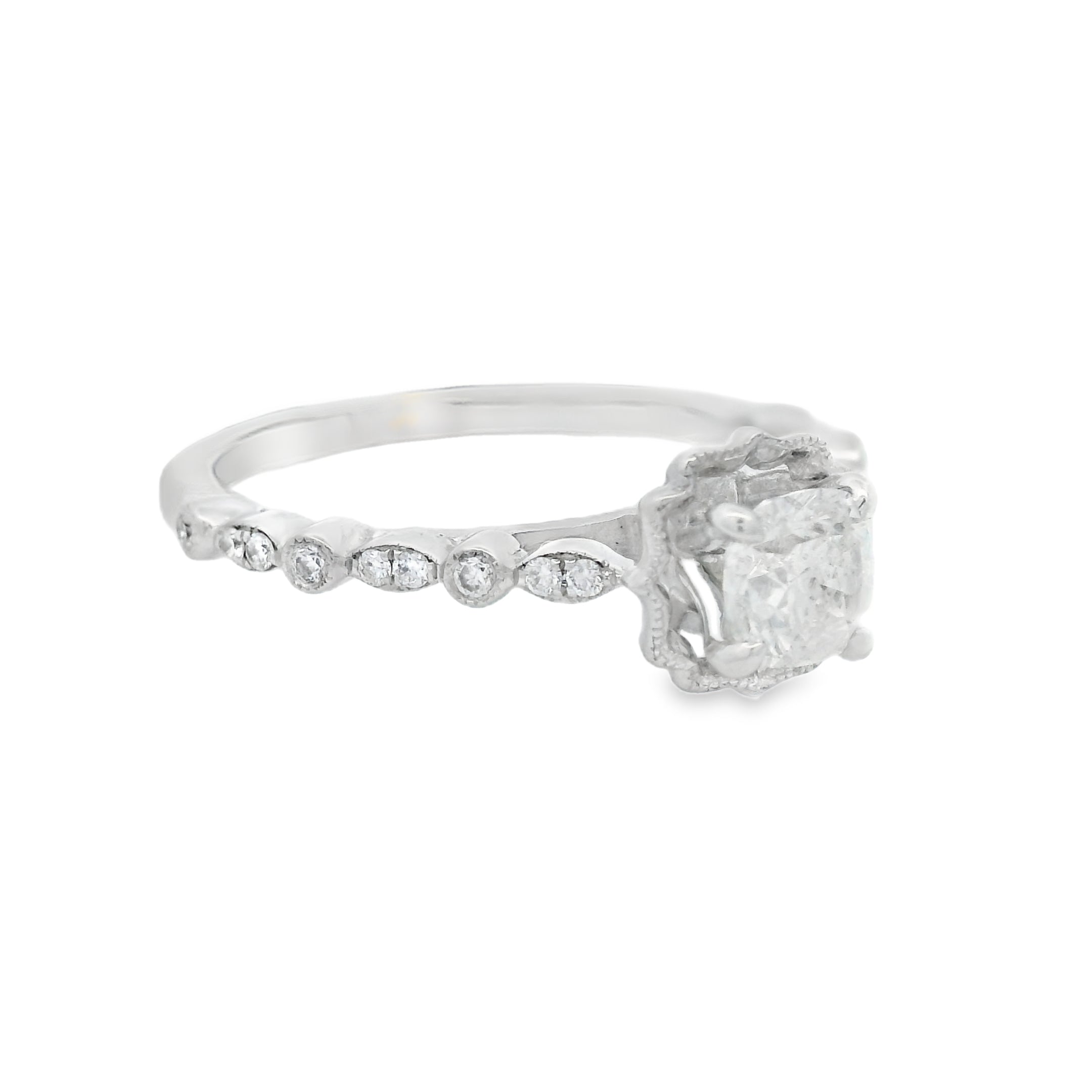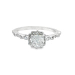 Vintage meets modern! Made with style in mind this ring is absoutly stunning! Featuring a 0.51CT Cushion Cut GIA certified center diamond this ring is truly something to be seen! With a halo style metalwork with millgrain as accents to add some true vintage style vibes to this piece. With diamonds down the dies and some more millgrain to top it off this ring will wow her for sure!