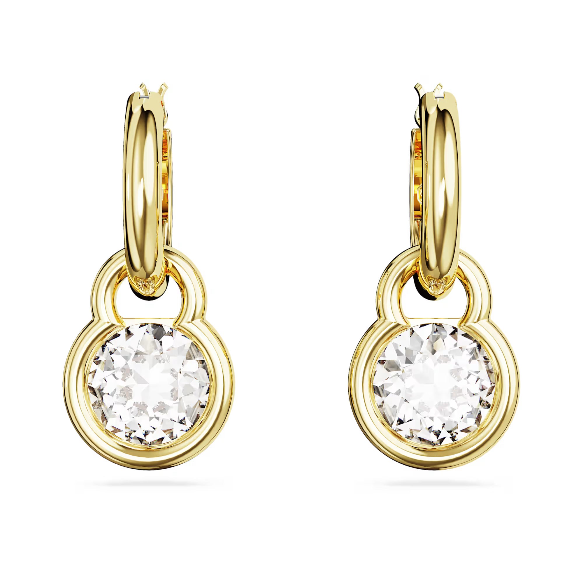 These Imber earrings were designed to turn heads. Each gold-tone plated piece features a bezel-set round stone connected to mini hoops that catches the light from every facet. A perfectly easy way to maximize your style in crystals.