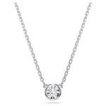 Effortless elegance is within reach thanks to this radiant Imber pendant. Suspended from a delicate chain with a lobster closure, the rhodium plated design features a central round-cut crystal in a puffy bezel setting. A single Swarovski Zirconia is also placed in the elongation for added radiance. Wear this piece to elevate your everyday style.