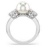 This refined Matrix cocktail ring delivers a fresh twist on a classic silhouette. The rhodium plated design is distinguished by a white Swarovski Crystal Pearl at the center, accompanied either side by prong-set Swarovski Zirconia. A luxurious piece offering instant elegance.