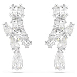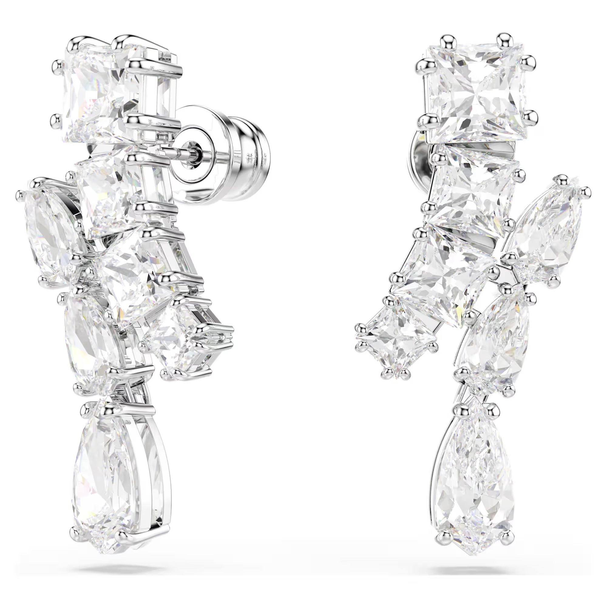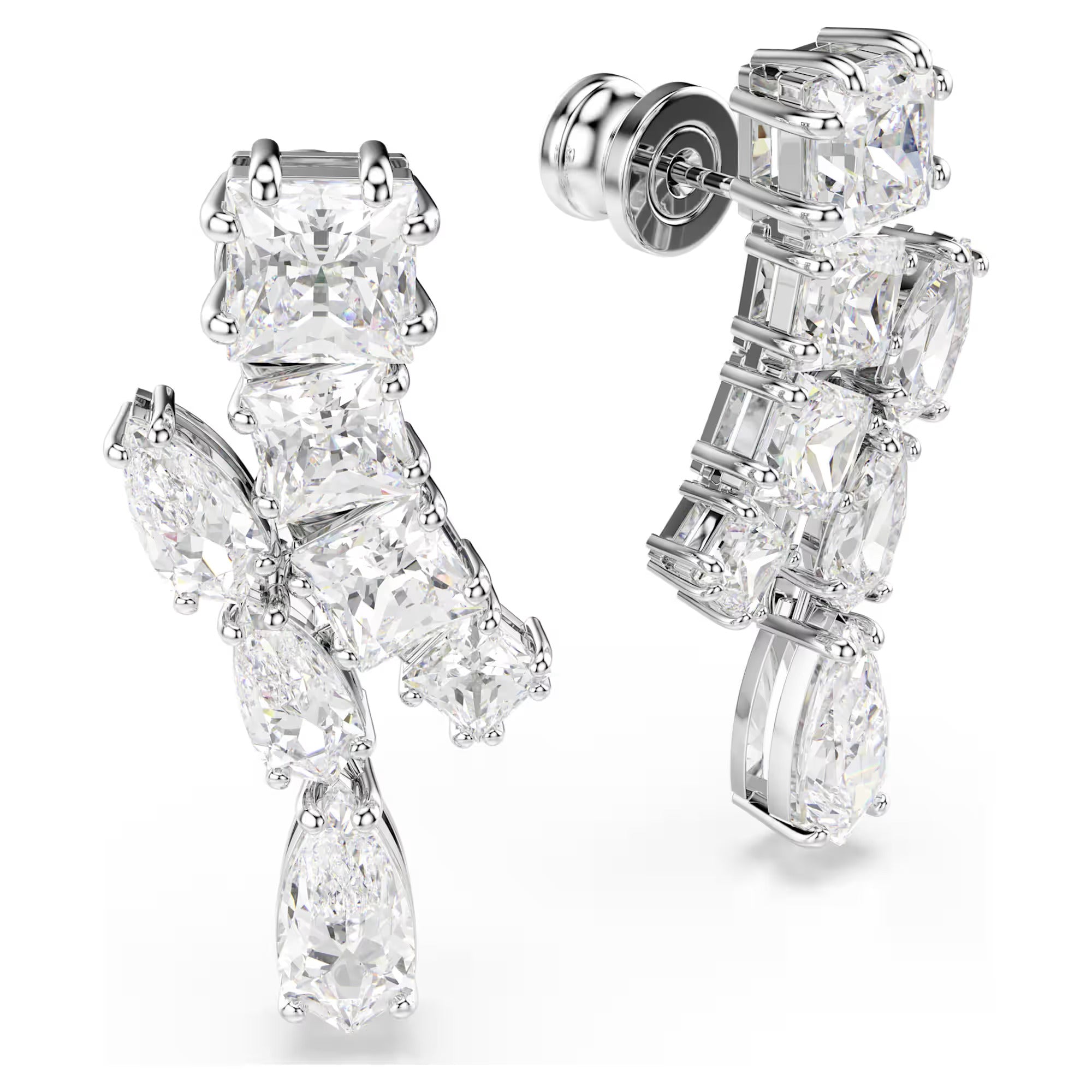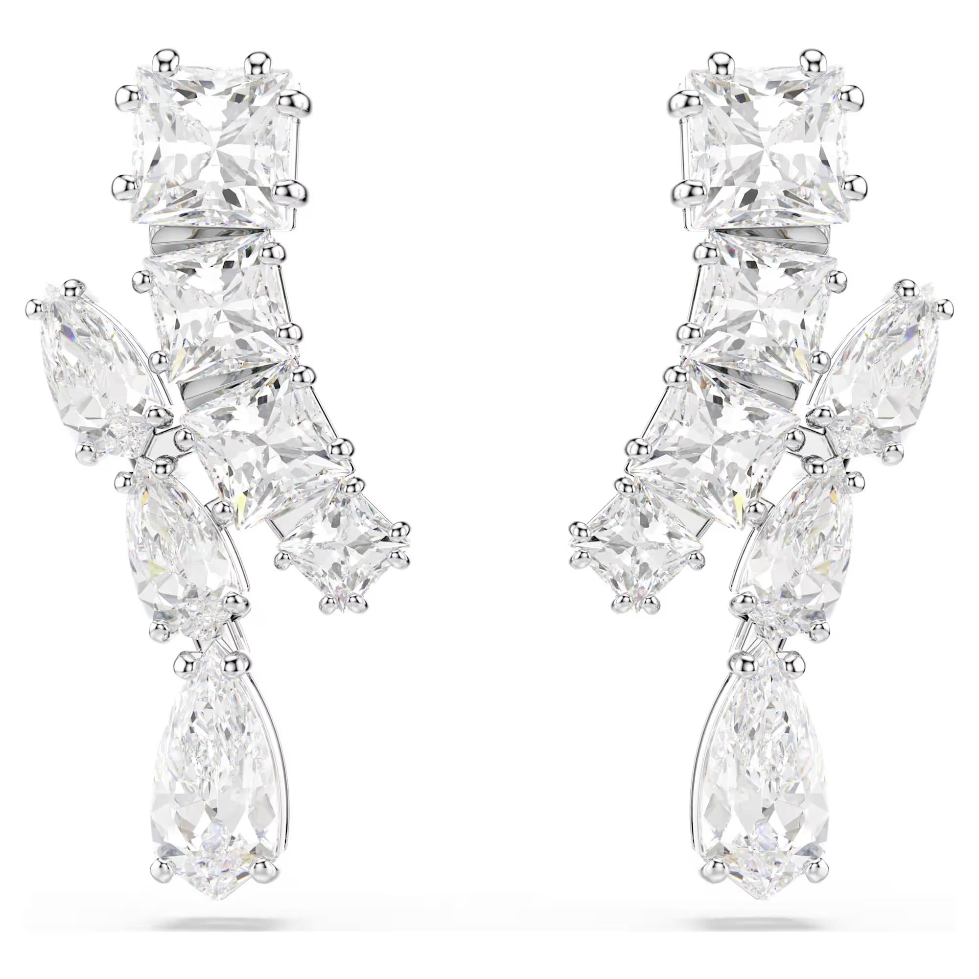 These dynamic pierced earrings shimmer with energetic radiance. Each piece is rhodium plated and adorned with a variety of prong-set Swarovski Zirconia in different cuts. The standout suspended element ensures the light reflects from every angle. Pair this set with a matching Matrix pendant for elegant everyday styling.