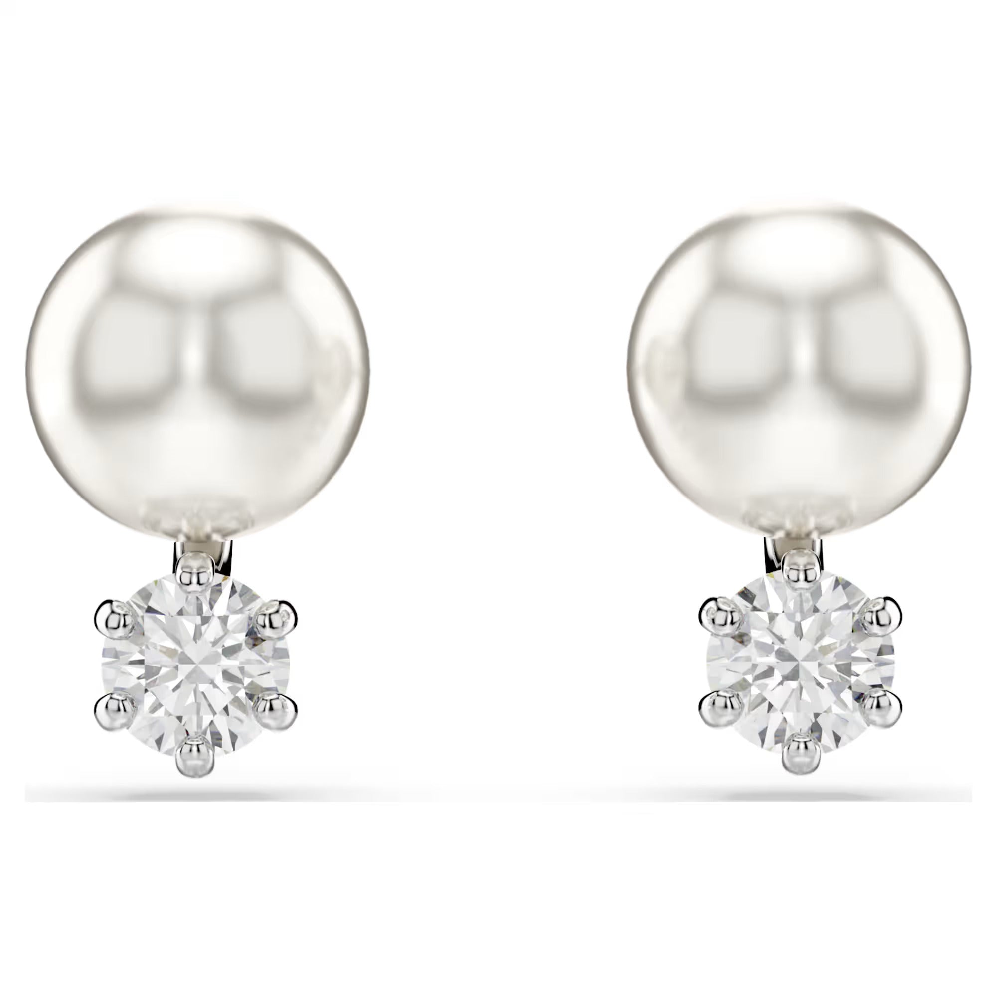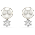 These stunning pierced studs are a fresh take on the classic pearl earring. Each rhodium plated piece features a single white Swarovski Crystal Pearl and a round-cut Swarovski Zirconia, linked in a refined display of light-filled luxury. Pair with a matching Matrix pendant for added radiance.