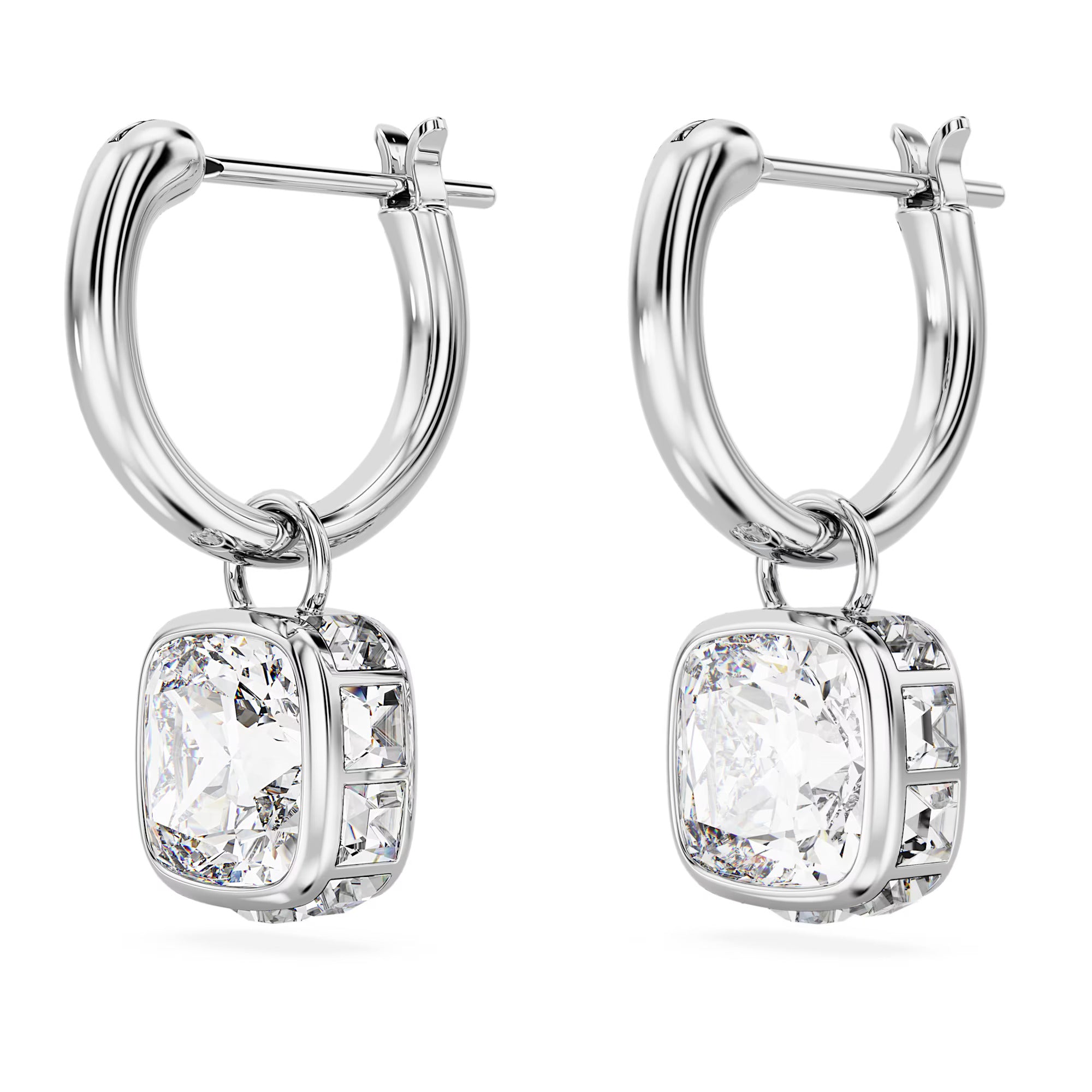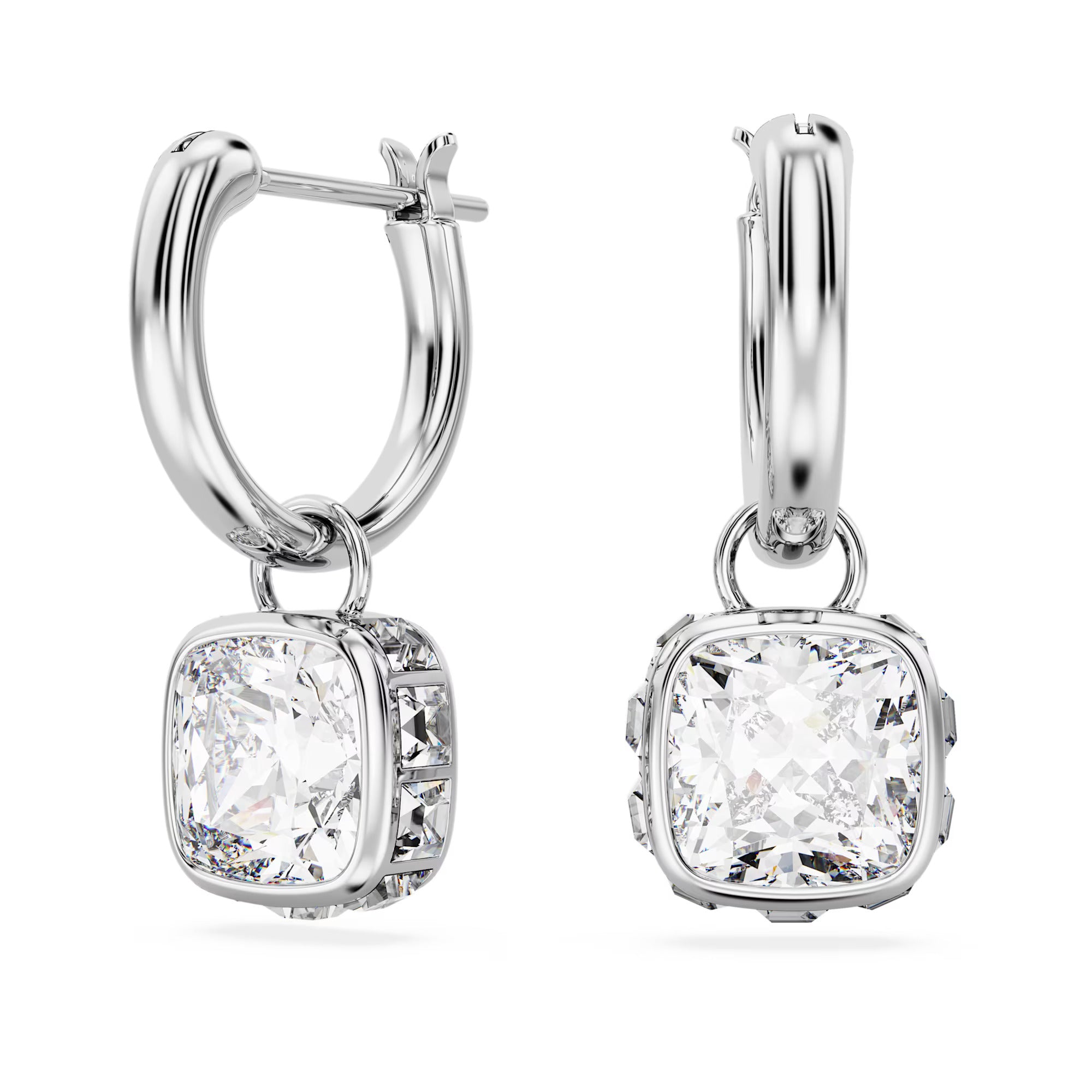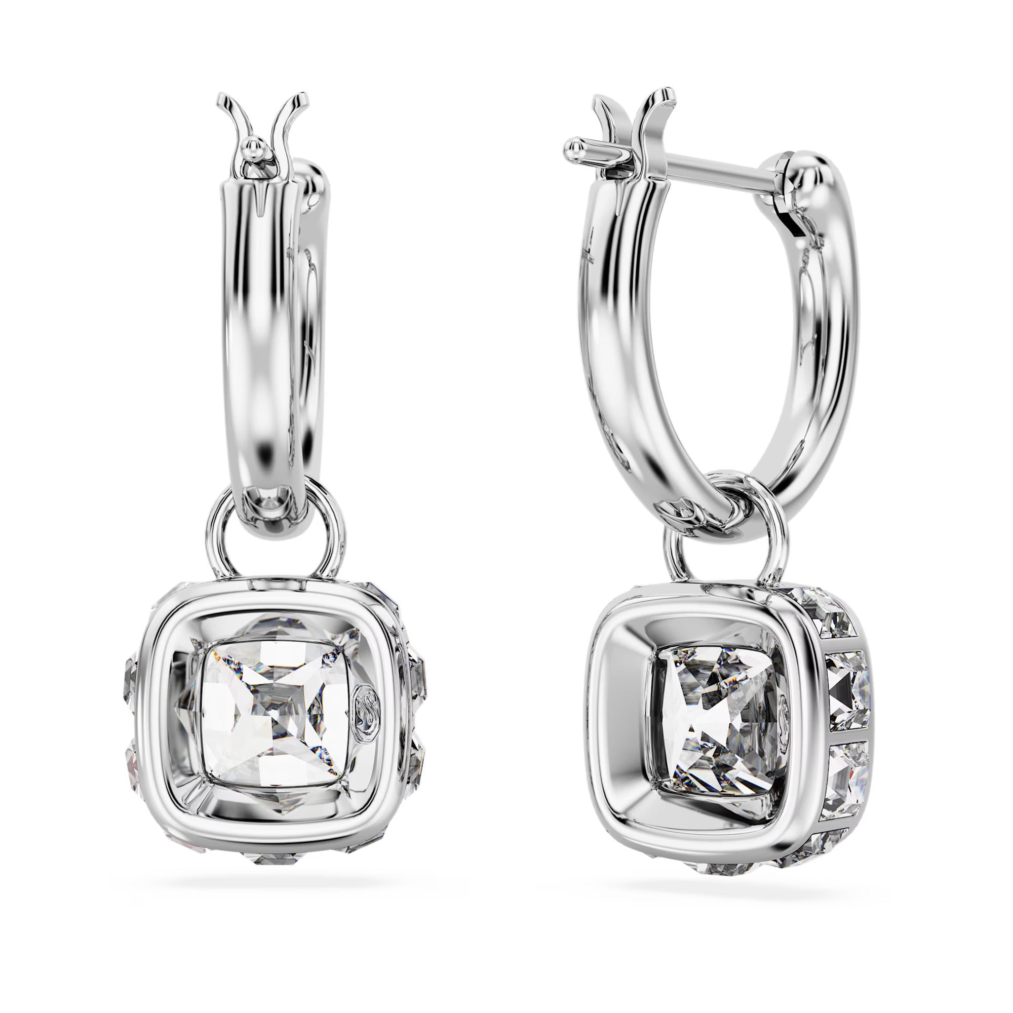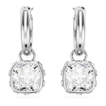 These radiant Chroma earrings are a perfect example of simple sophistication. Each rhodium plated piece features a clear facetted Swarovski Zirconia surrounded by clear square crystals hanging from a crystallized mini hoop. Effortless elegance.