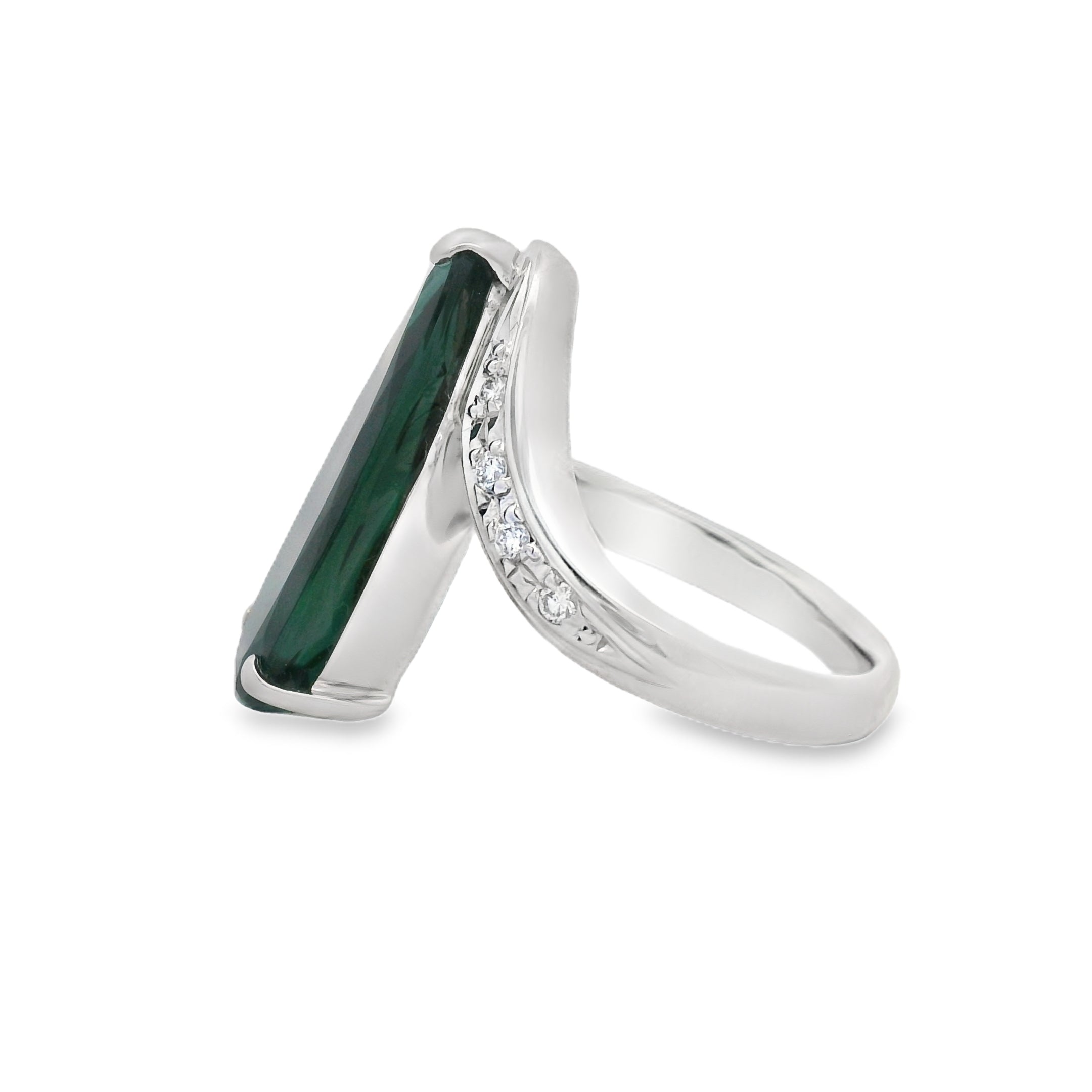 Discover the allure of this exquisite green indicolite tourmaline ring, designed to captivate and inspire. The stunning teardrop-shaped stone is elegantly set in a sleek silver band, adorned with sparkling accents that enhance its beauty. Perfect for any occasion, this ring is a statement piece that adds a touch of sophistication to your jewelry collection.