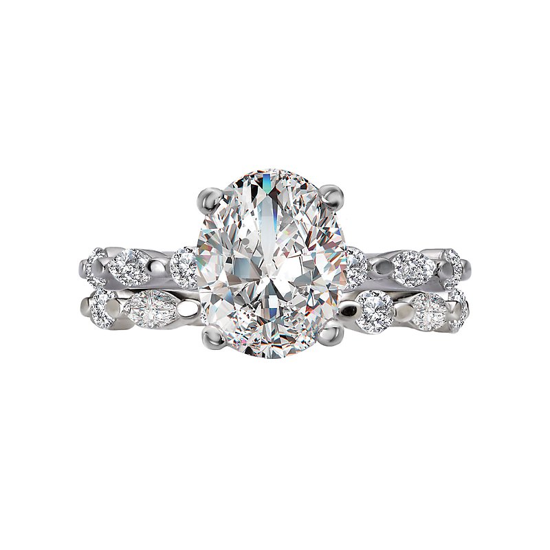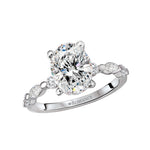 14kt white gold semi-mount engagement ring has alternating round and marquise diamonds along the band on either side of a center setting that will accommodate a 10x7mm oval shaped diamond. (D 1/3 carat total weight)