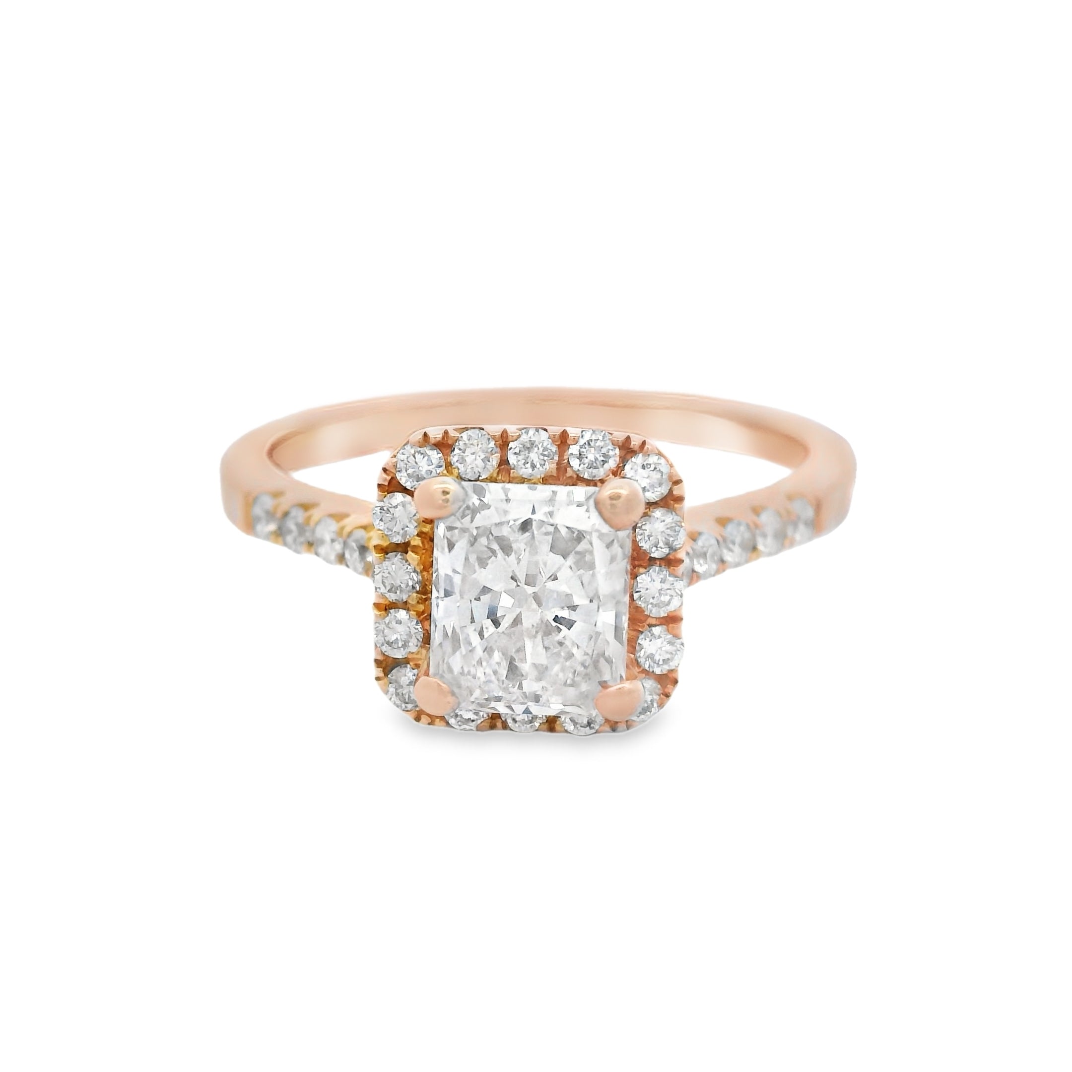 This stunning rose gold engagement ring features a radiant-cut diamond at its center, surrounded by a halo of sparkling smaller diamonds. The intricate band is adorned with additional diamonds, adding to its brilliance and elegance. Perfect for making a memorable proposal or celebrating a special occasion.