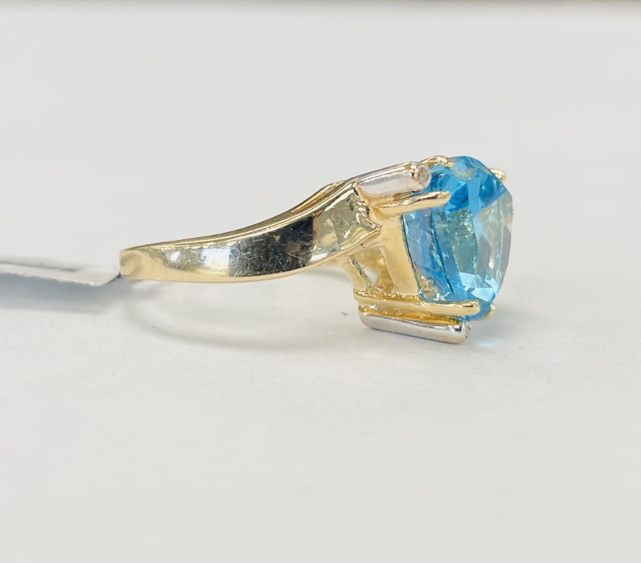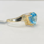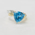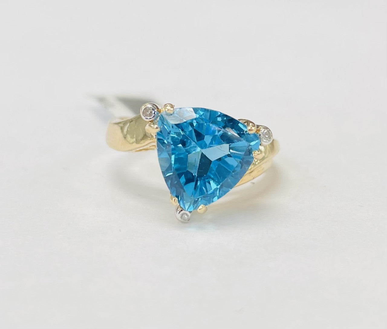 This beautiful blue topaz has the eye catching blue hues and saturation that you usually only see in dreams. Cut in a trillion shape to give it the most color, the twisty and flowing style of the ring accents the stone perfectly. Accented by diamonds near the points of the blue topaz just to give it that extra something!