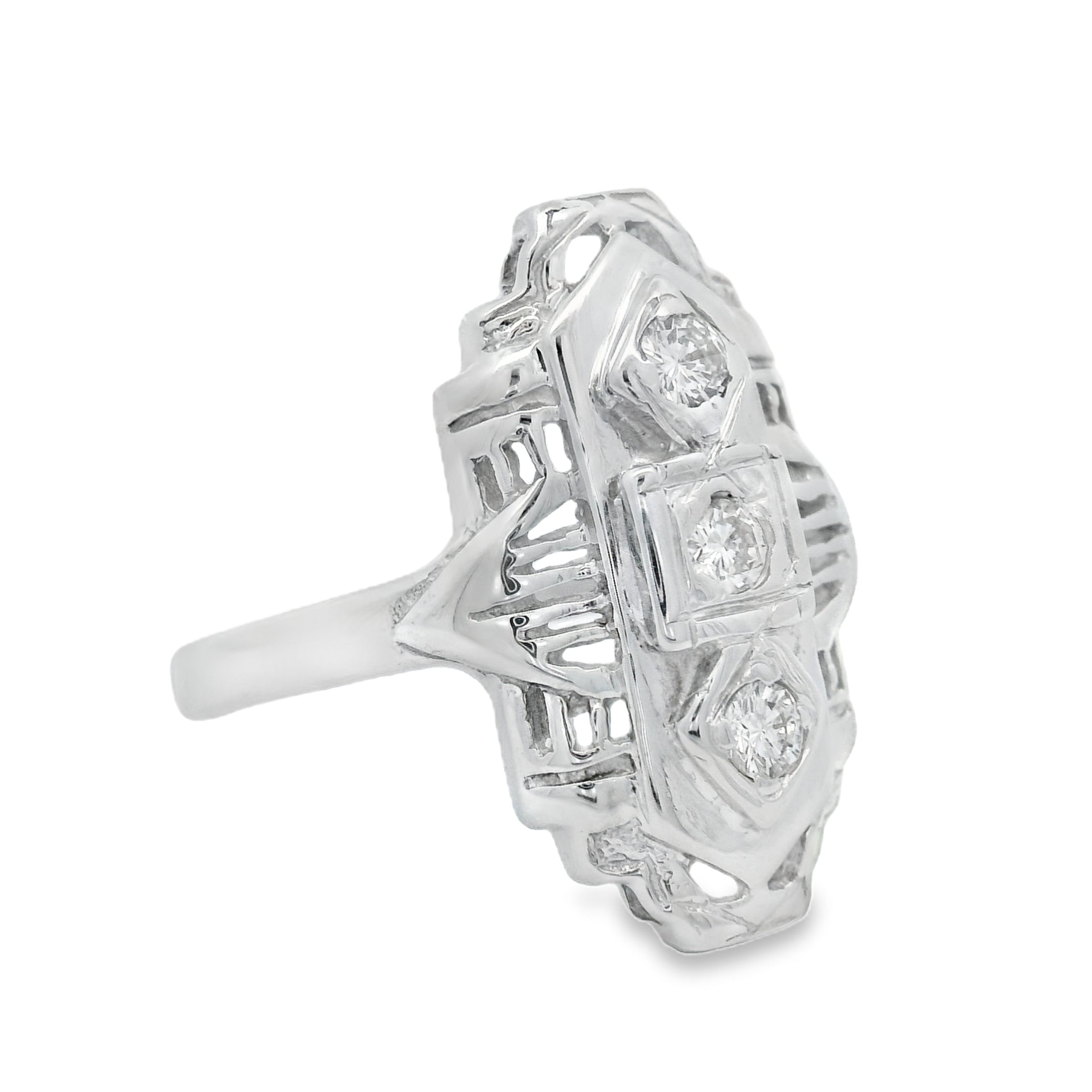 This simple and elegant ring features three diamonds vertically with vintage etching all around. Made out of white gold this ring is perfect for the vintage lover in your life