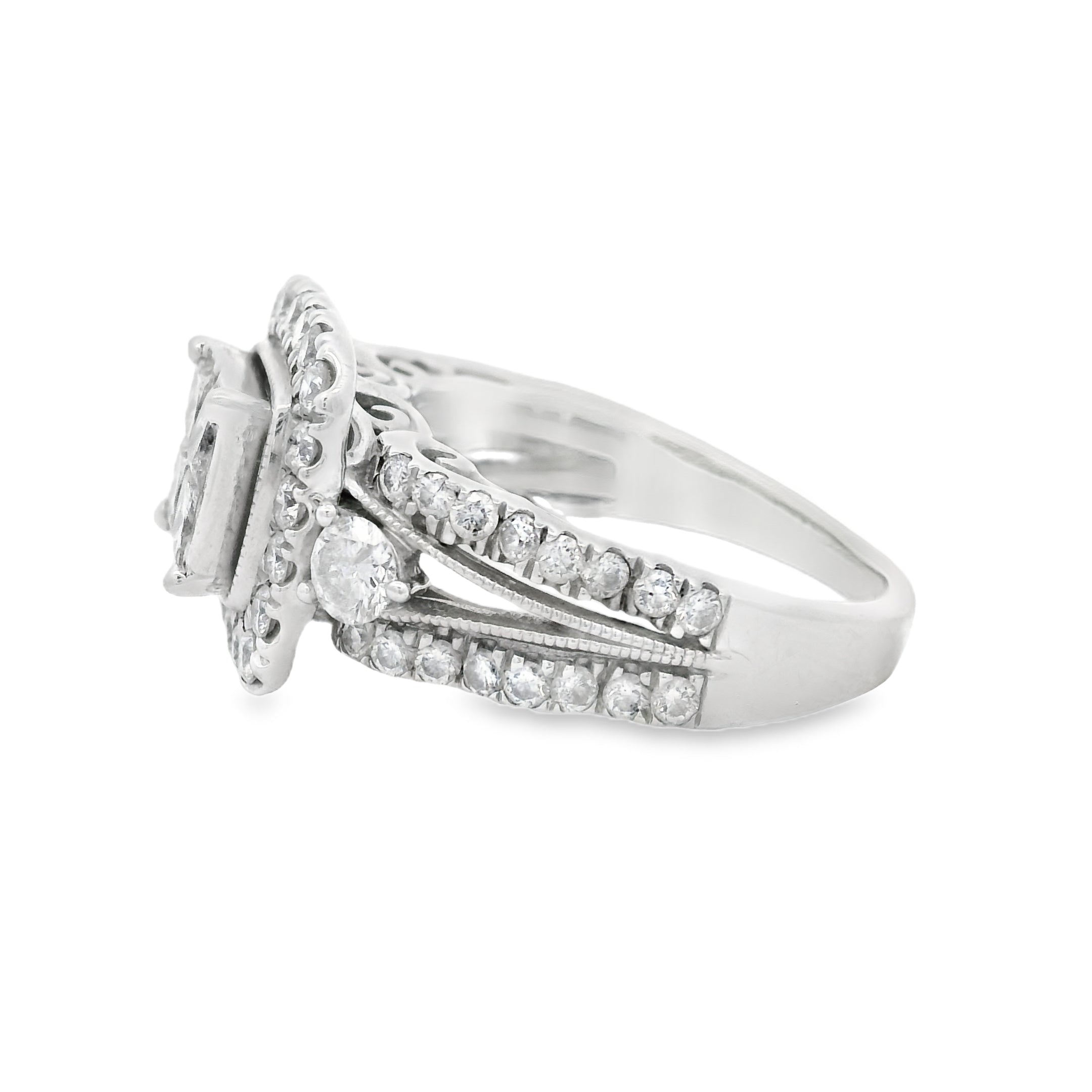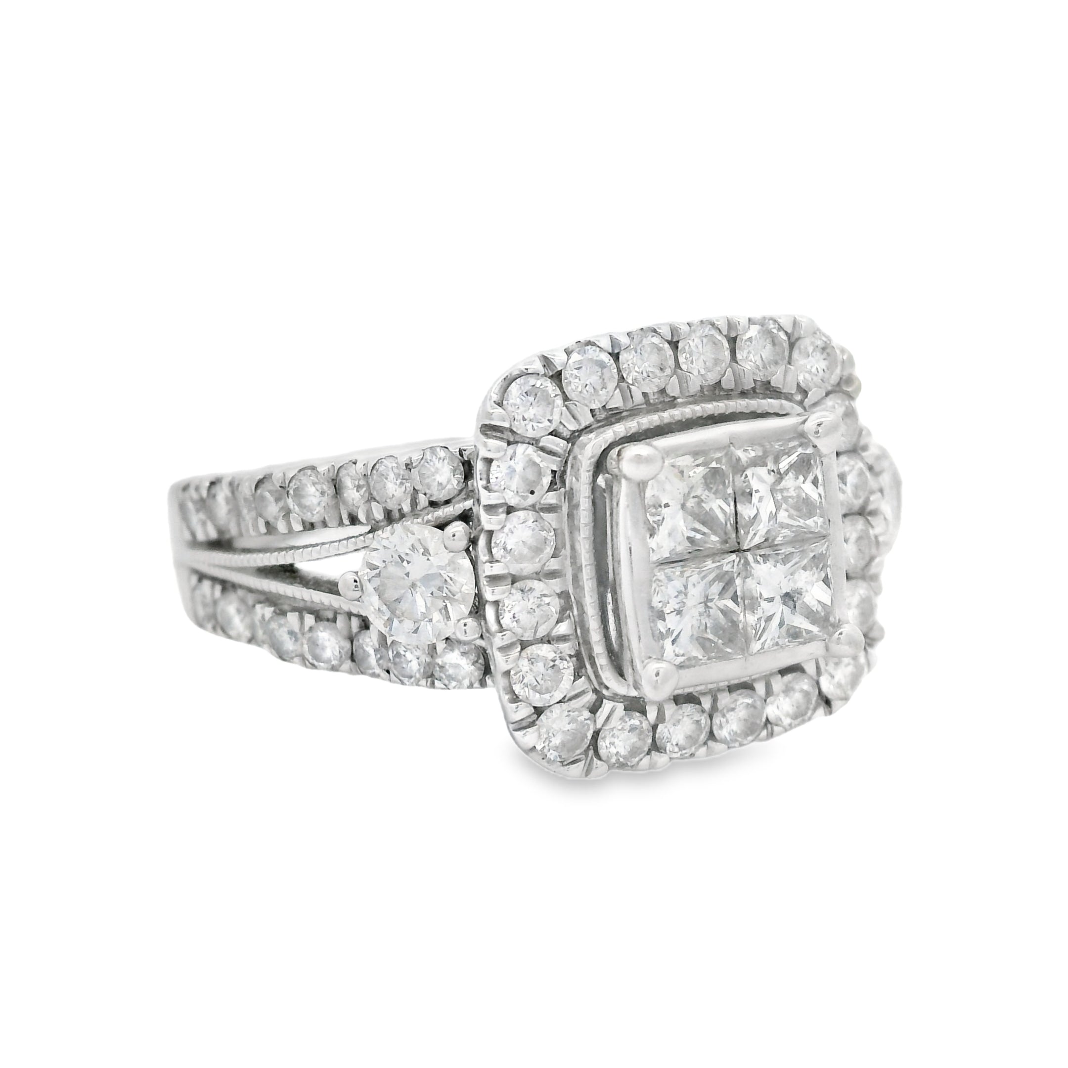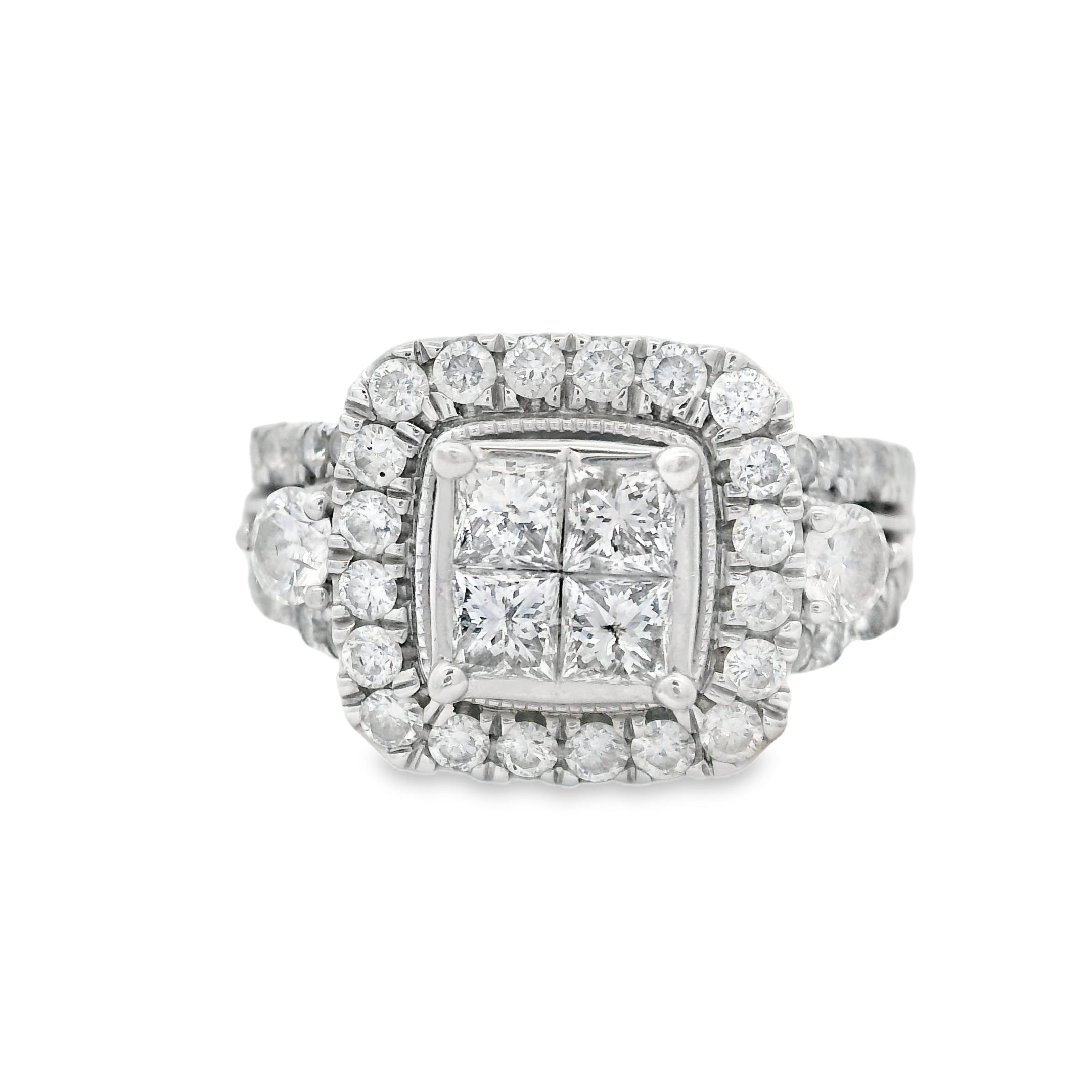 This stunning ring features four princess cut diamonds in the center with a dazzling round brilliant halo around the four center stones. Accented even more by round brilliant diamonds on the split shank. With a beautiful crafted undercarriage to top it off this ring is a sight to behold.