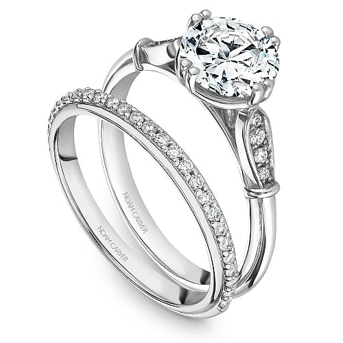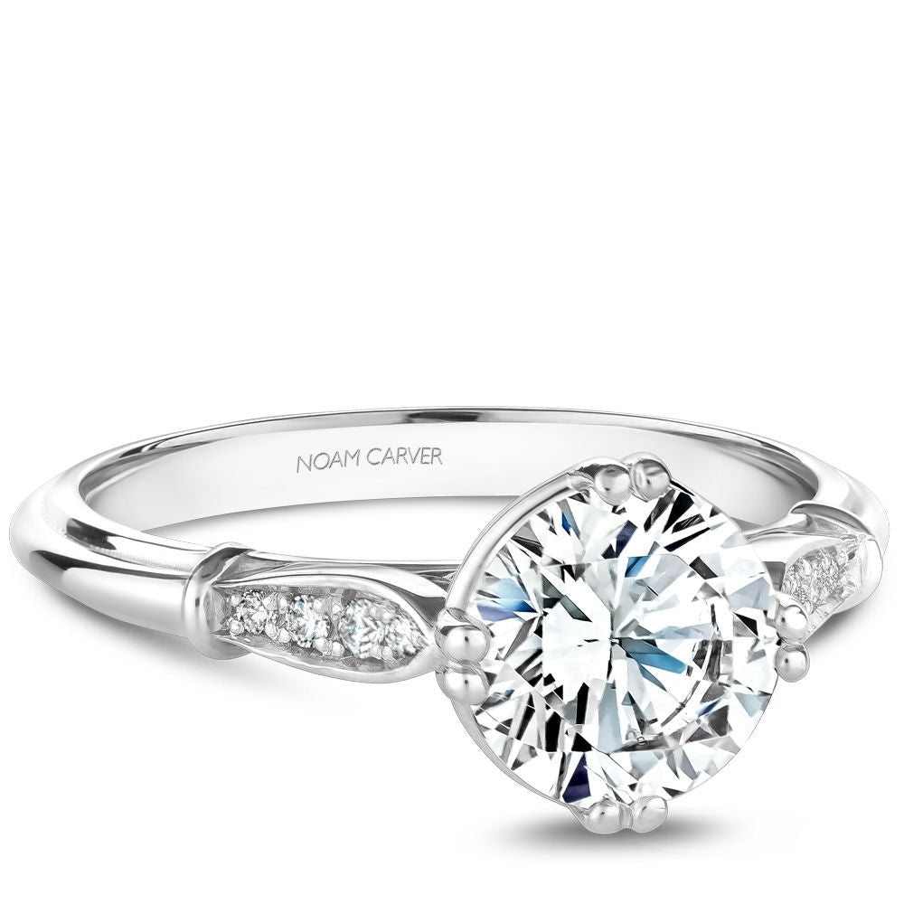 The Noam Carver B267-01A is a vintage-inspired engagement ring crafted in 14K white gold. Featuring delicate side diamonds and a claw-prong setting, this design beautifully frames your chosen center stone. With its timeless detailing and elegant proportions, it’s a perfect blend of modern craftsmanship and vintage charm. Pair it with the matching Noam Carver B267-01B band for a complete bridal set.
