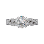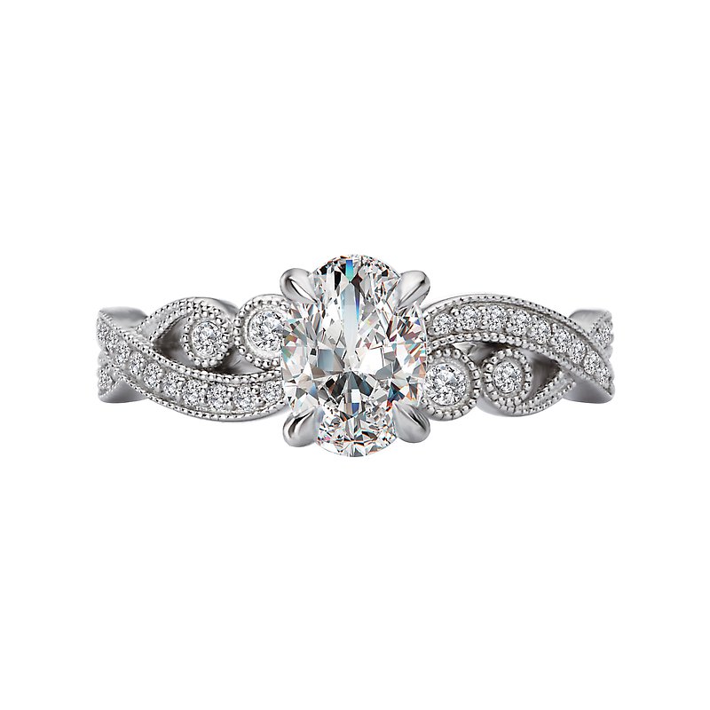 A detailed and elegant vintage inspired setting. Featuring a beautiful designed shank with round brilliant diamonds. Accented by millgrain to give that extra vintage feel. This 14kt white gold semi-mount engagement ring has elegant paisley insired milgrain design along with a fancy peg head setting that will accommodate a 7.5x5.5mm oval diamond. (D 1/5 carat total weight)