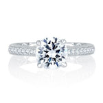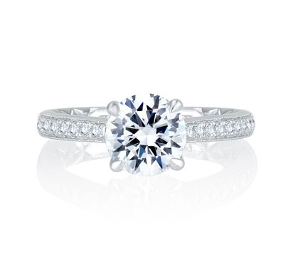 As a part of the delicate quilted collection, this stunning round four prong diamond engagement ring showcases an exquisite quilted interior and beautiful micro pave diamonds along the A.JAFFE signature shank.