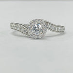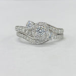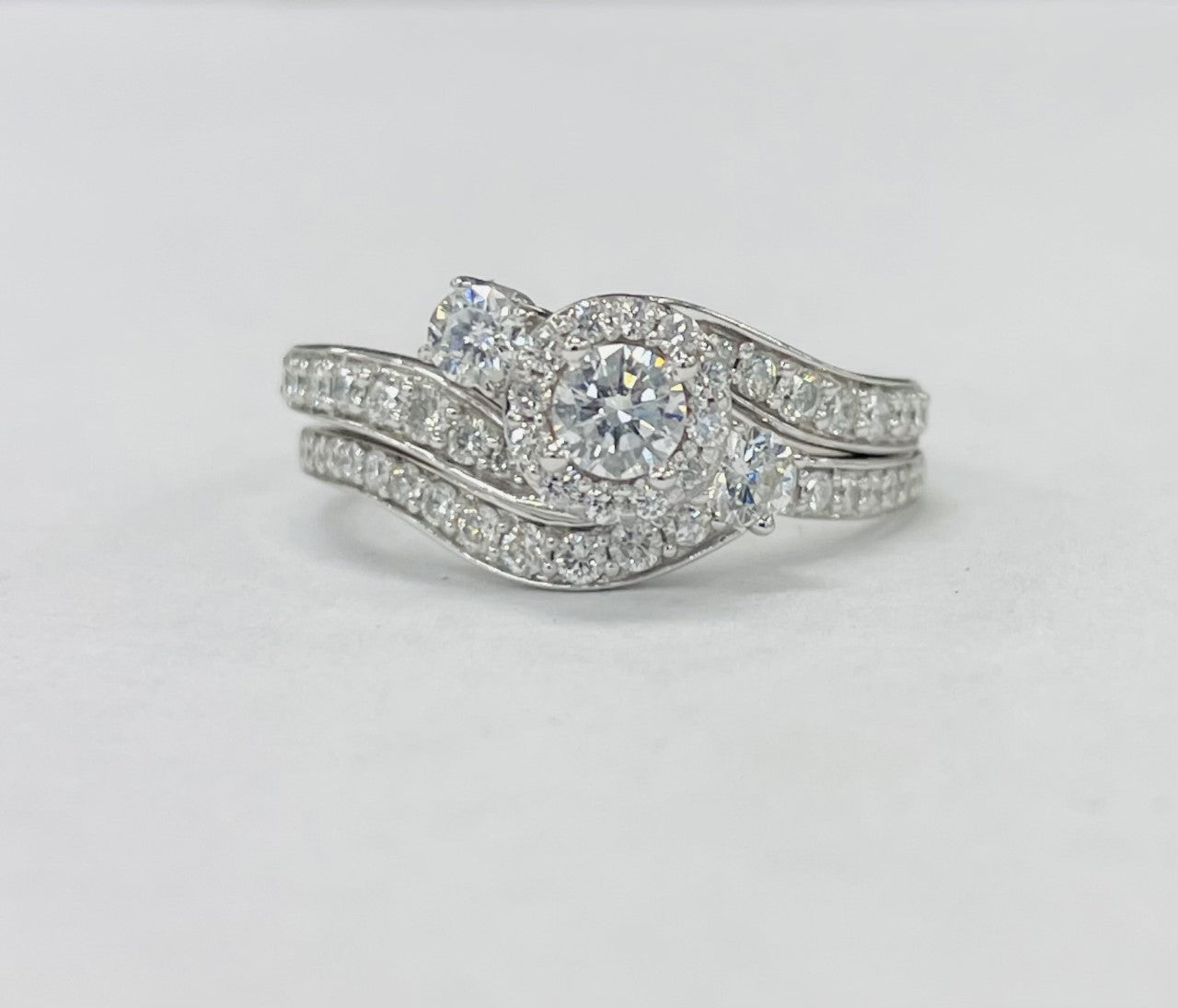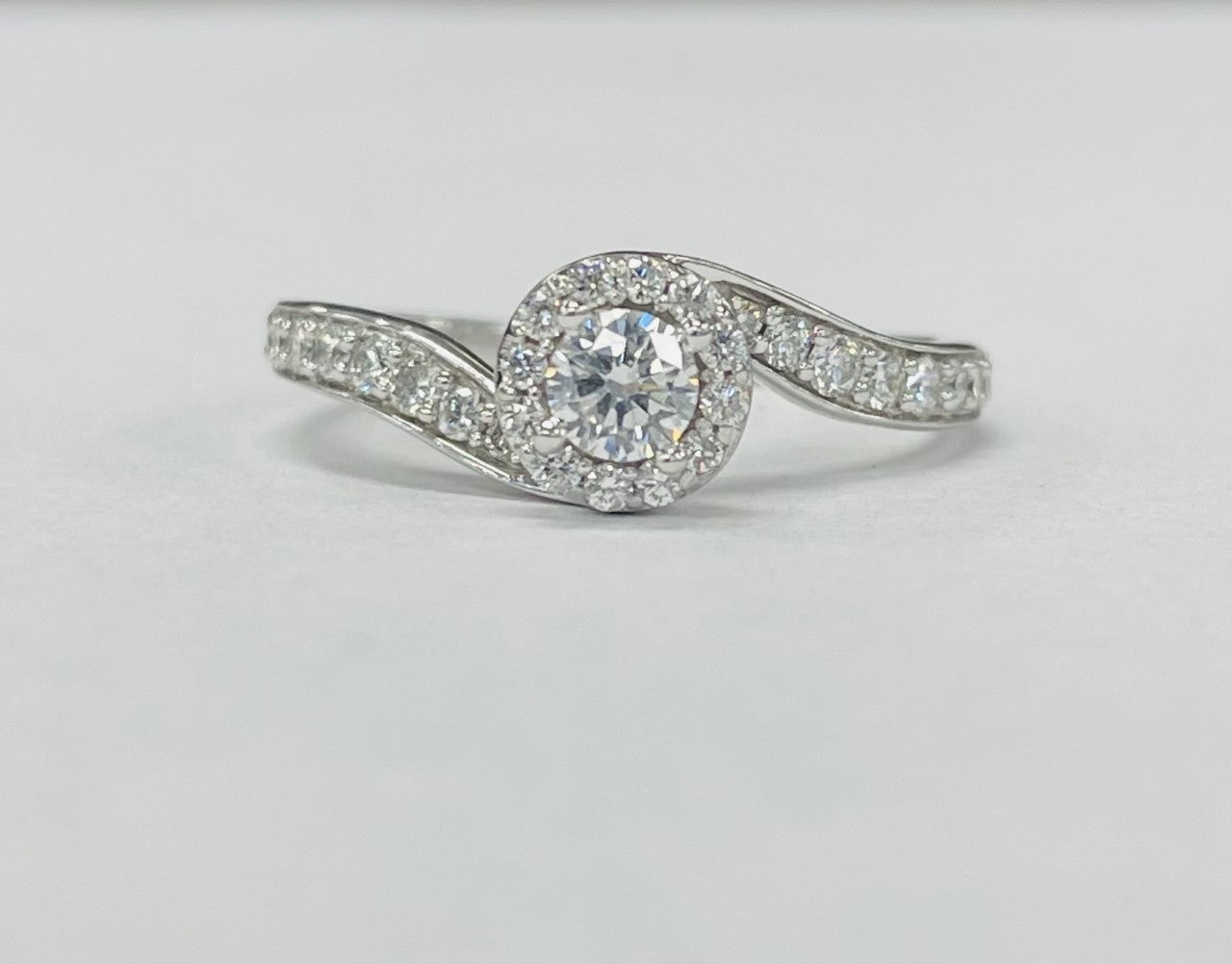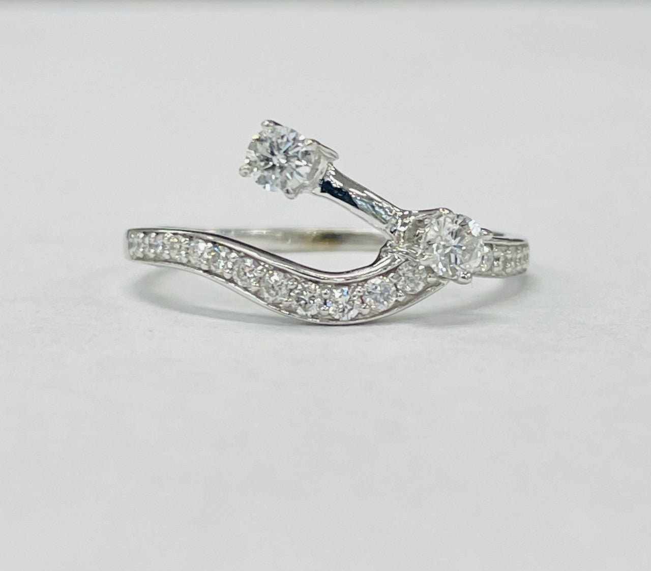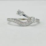 This beautiful free form modern diamond engagement ring is truly something to behold. Made with a blend of a three stone and twist design this ring is sure to be the center of attention in any conversation. With an added wrap to bring it all together as one ring and so many diamonds, it will for sure light up her world!
