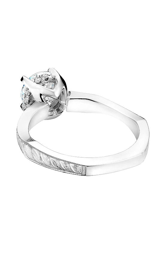 A vintage feel with a modern twist. This simple and stunning setting features a very modern style and shaped shank. Accented by stunning engraving and millgrain to give it a true vintage feel. As if that wasent enough, this setting also features a hidden halo to add just that little extra bling to her ring.