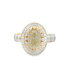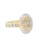 The Noam Carver Wedding & Bridal Collection is celebrated for its artistry and timeless elegance. The NCAW-06YM-200A-C ring combines 14K yellow gold with white enamel detailing, creating a striking contrast that highlights its luxurious design. Fourteen round accent diamonds (0.20cttw) add brilliance along the band, while the centerpiece—a 1.50ct Oval Modified Brilliant Diamond (VVS2, Q-R color, GIA 2454694580)—offers exceptional sparkle and sophistication. Crafted with precision and comfort-fit design, this ring is ideal for brides seeking a unique, modern yet classic engagement or wedding ring. Discover the exquisite beauty of this elegant yellow diamond ring. Featuring a stunning oval-shaped center stone surrounded by intricate detailing, this piece is perfect for those who appreciate fine craftsmanship. Its unique design makes it a standout accessory for any occasion.