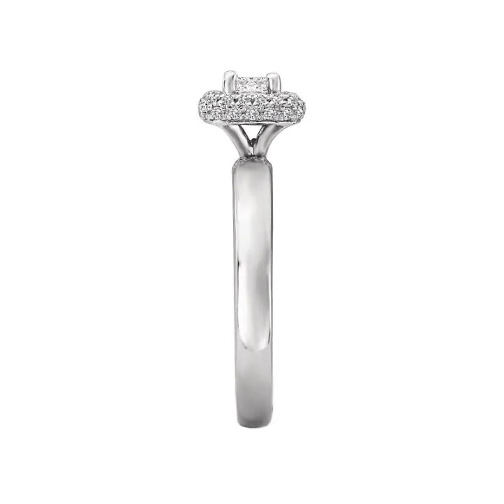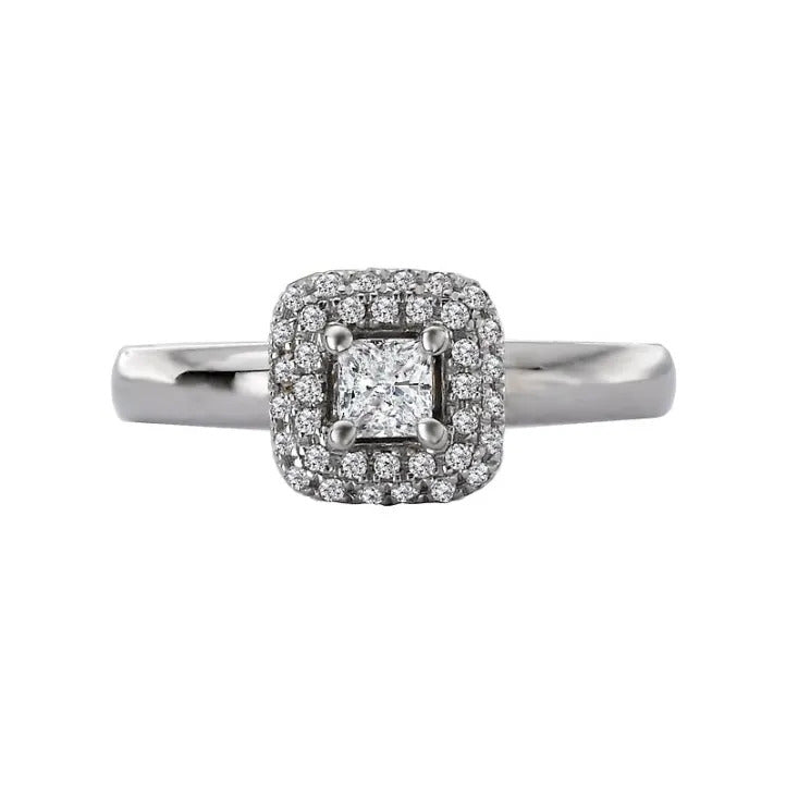 Double row diamond halo ring created in 14kt white gold. (D 1/4 carat total weight) This item is a SEMI-MOUNT and it comes with NO CENTER STONE as shown but it will accommodate a 3.4mm cushion or princess cut center stone.