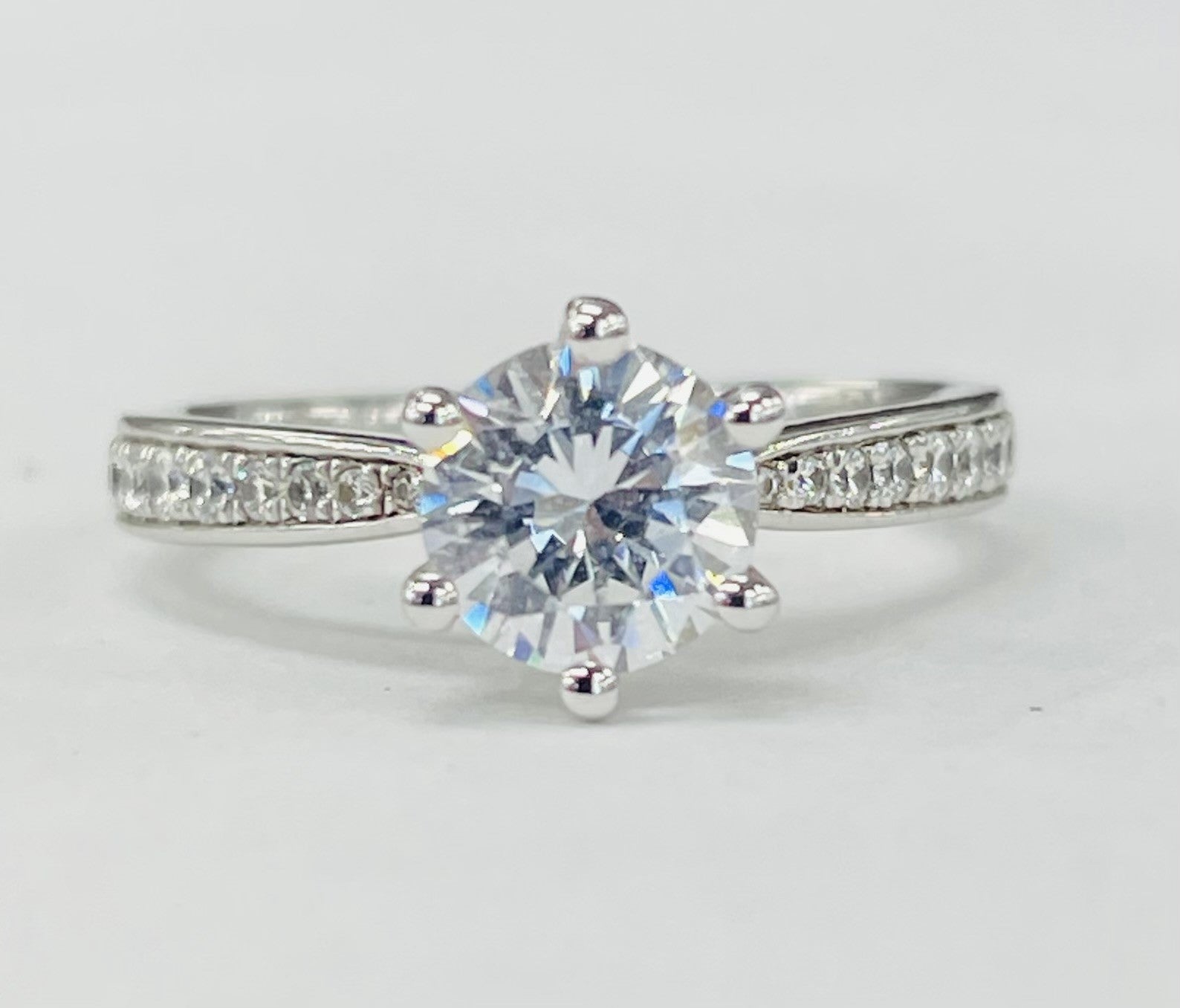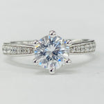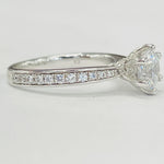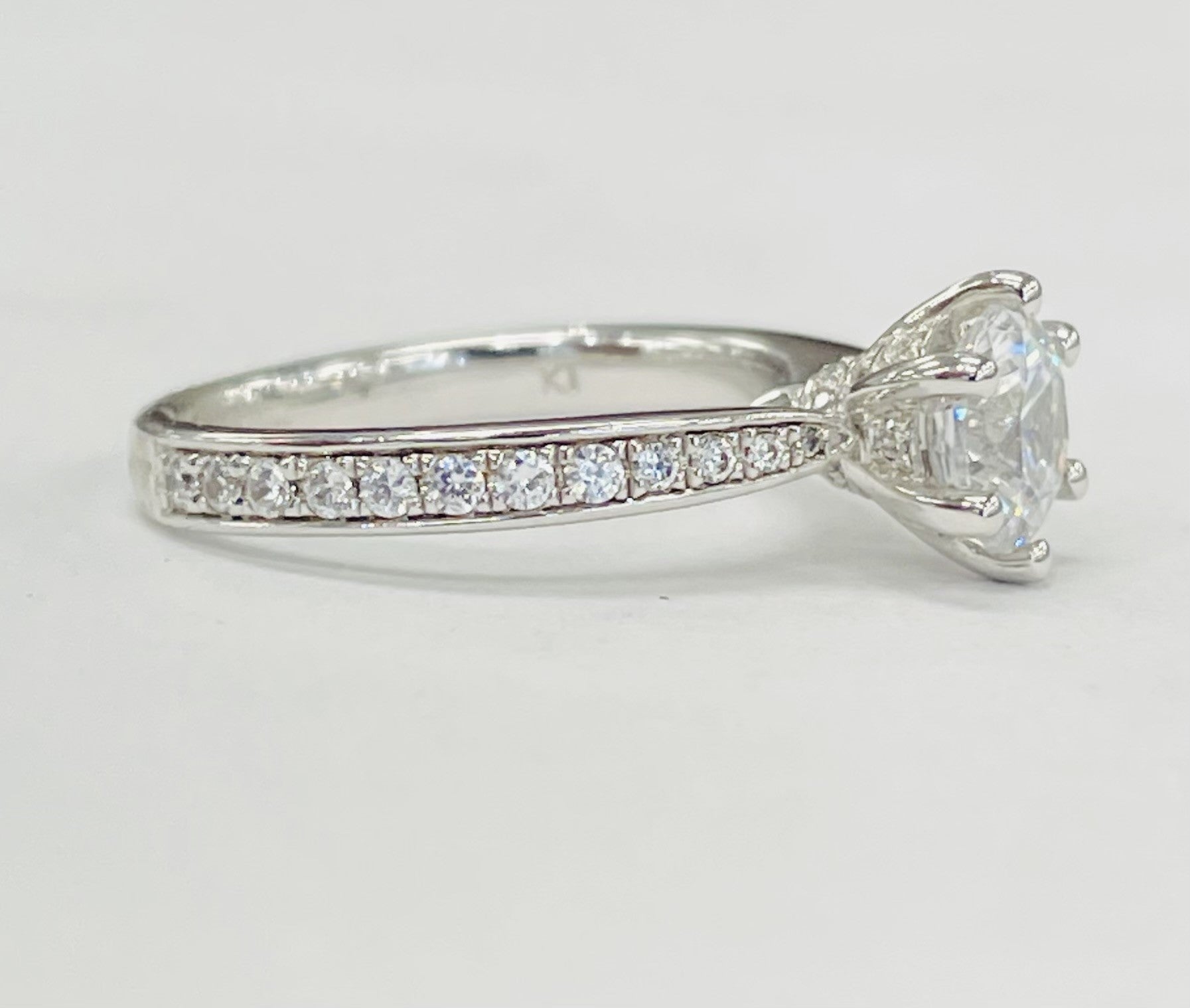 A classic setting with style. This ring features a six prong head with diamonds on the undercarriage. Accent round brilliant diamonds go down the sides to give more sparkle.