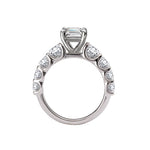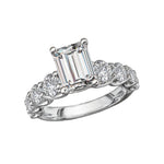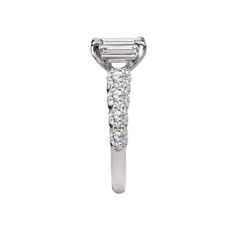 14k white gold semi-mount engagement ring with eight round diamonds adorning the band, four on either side of a center peg head setting that will accommodate an 8.5 x 6mm emerald cut stone. (D 1 3/8 carat total weight)