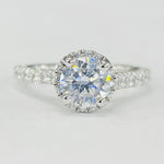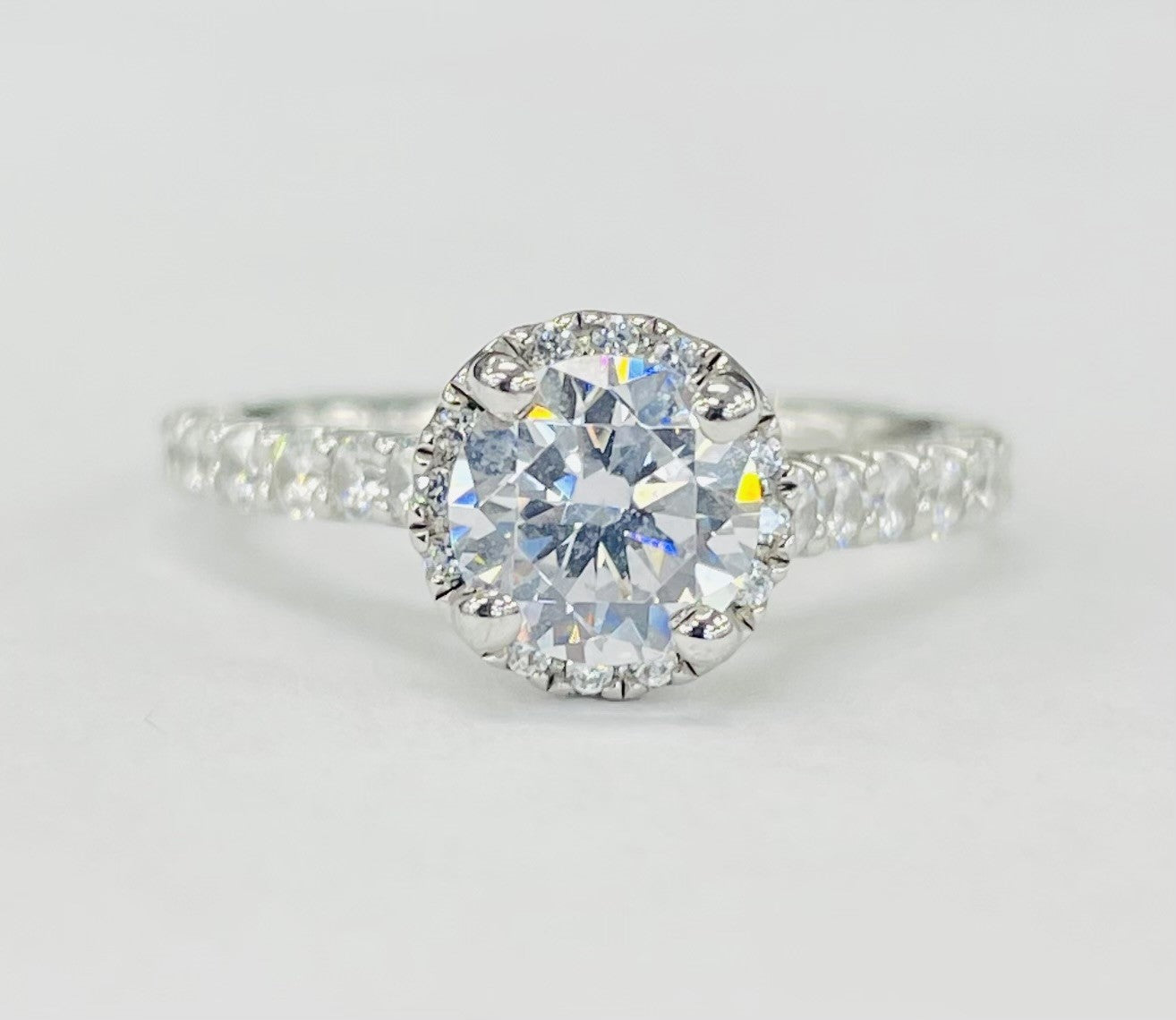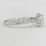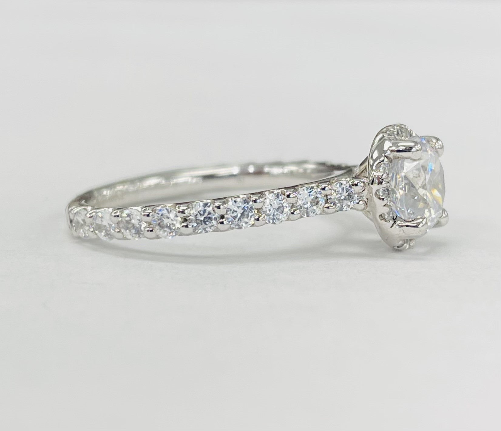 This hidden halo ring features a plethra of accent diamonds on the shank. With diamonds underneath and around the center stone this ring is meant to catch everyones eye. Along the shank there are diamonds that go three fourth of the way down to give it that extra flair.