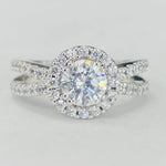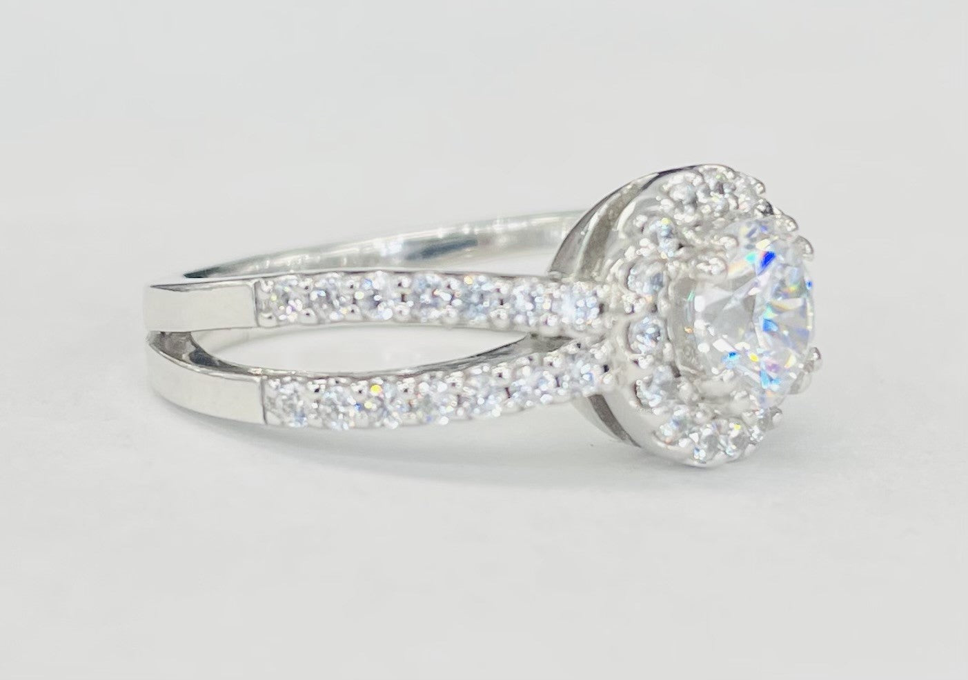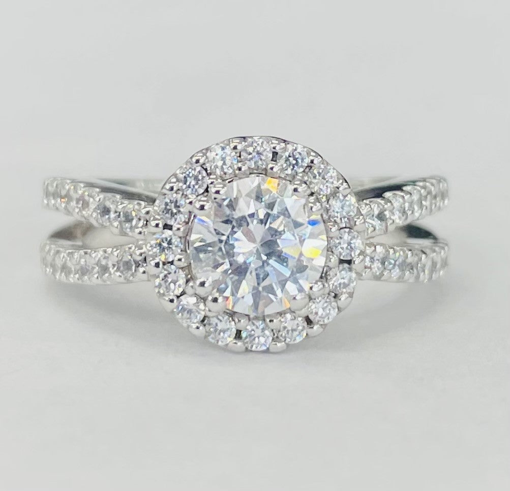 A true modern style setting. This setting features a open split hank with a low set halo. Accented by diamonds all around the shank and halo. A dazzling and beautiful rign to give to your better half.