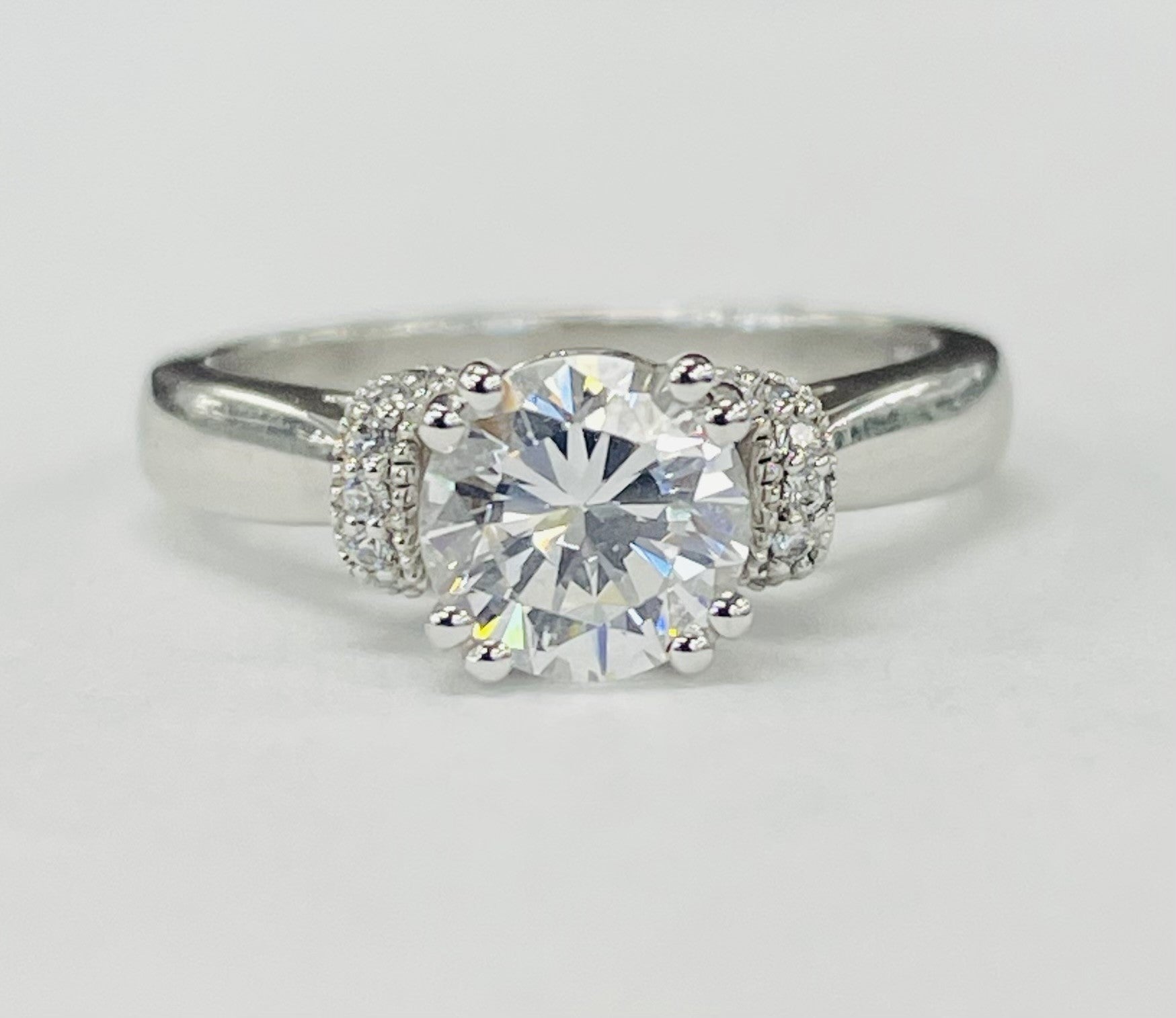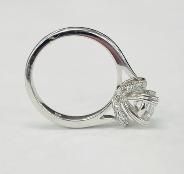 A solitare with a mdoern twist. With a eight prong head and a stunning diamond undercarriage, this ring is a beautiful blend between modern and sparkle.