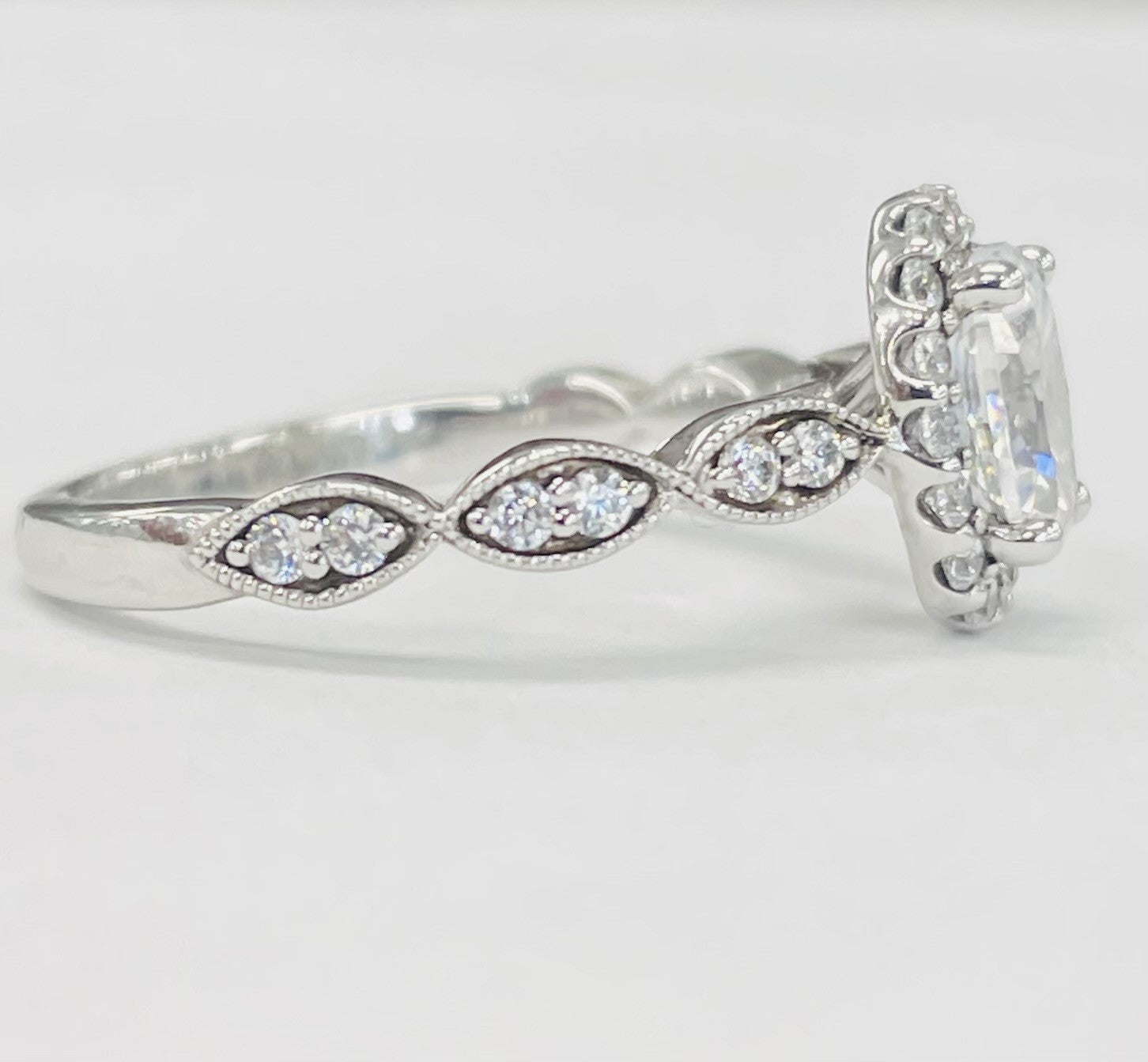 A blend of two styles, the simple modern halo and the scalloped millgrain vintage inspired shank with diamonds.
