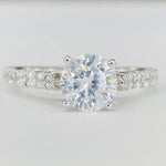 This stunning cathedral setting is made with pave shared prong diamonds to ccent. The diamonds go almost all the way around for maximum ammount of diamonds and sparkle to ensure the beauty of this ring.