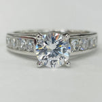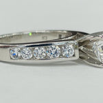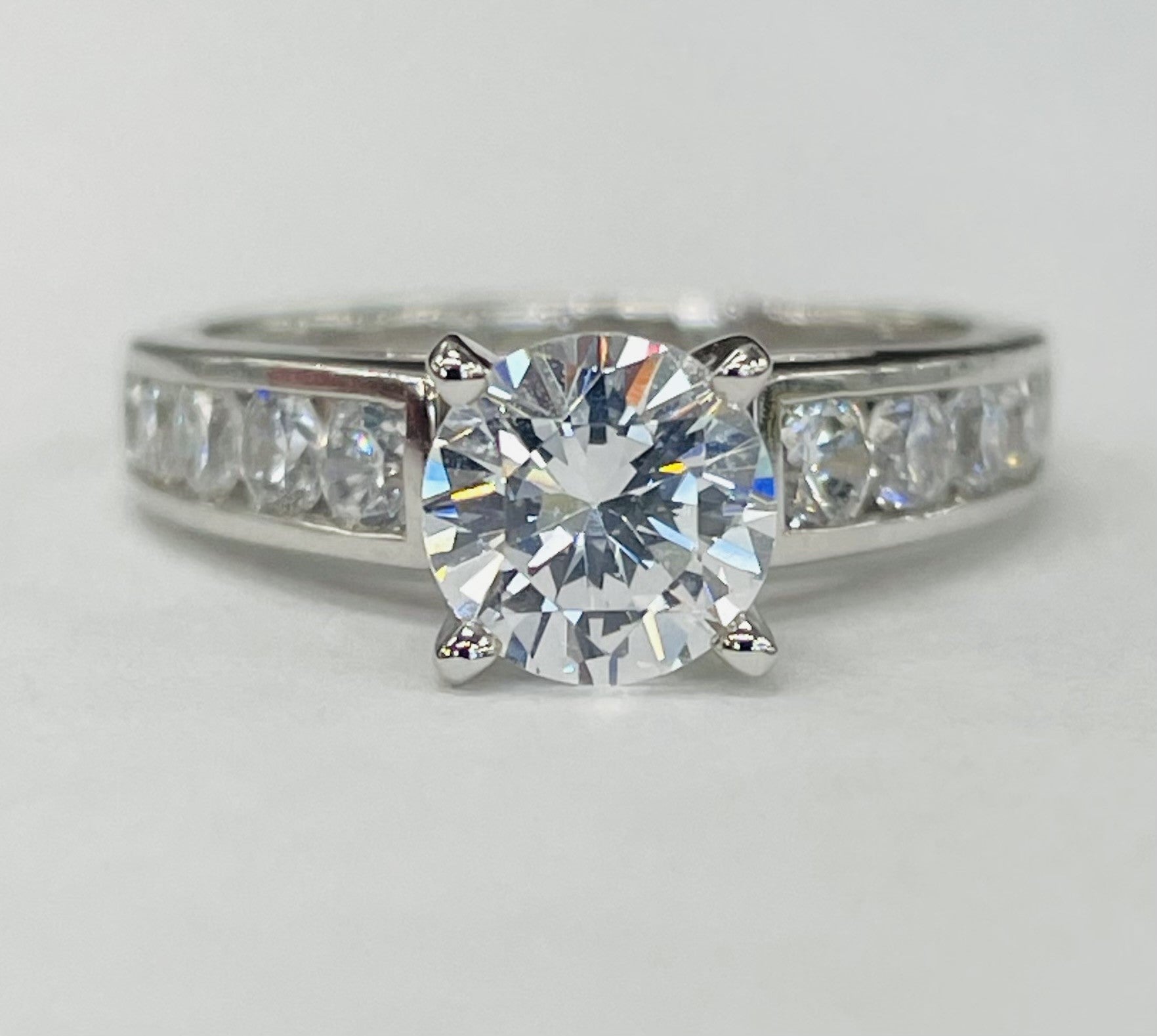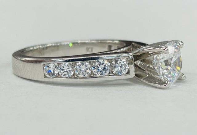 Round channel set diamond ring in 14kt white gold with a 14K peg head center. (D. 5/8 carat total weight) This item is a SEMI-MOUNT and it comes with NO CENTER STONE as shown but it will accommodate a 6.5mm round center stone. peg head