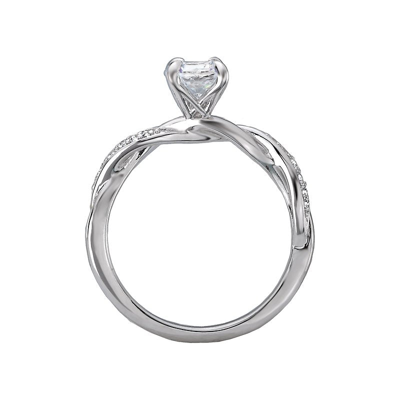 A twisted shank lined with sparkling diamonds creates this elegant bridal ring crafted in white gold. Also a high polish to contrast the diamonds.