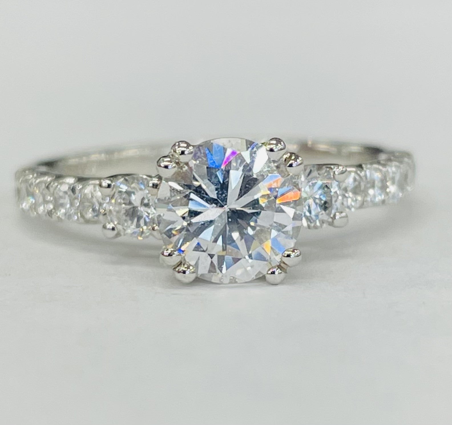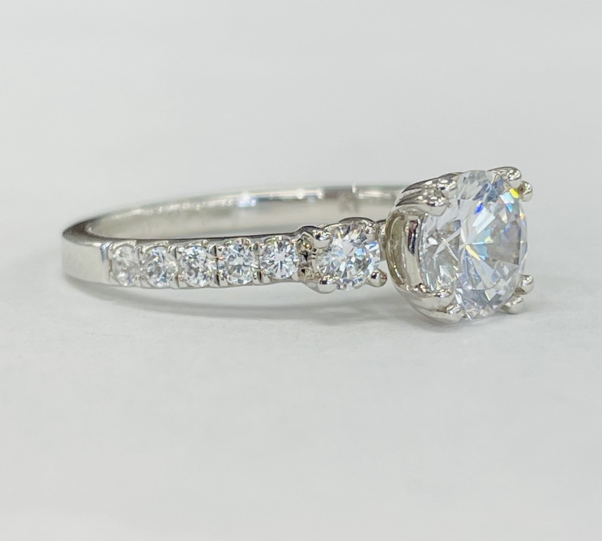 A three stone diamond setting with beautiful prong set round brilliant diamonds down the sides. Made to fit your perfect center stone this ring says I will love you ever.