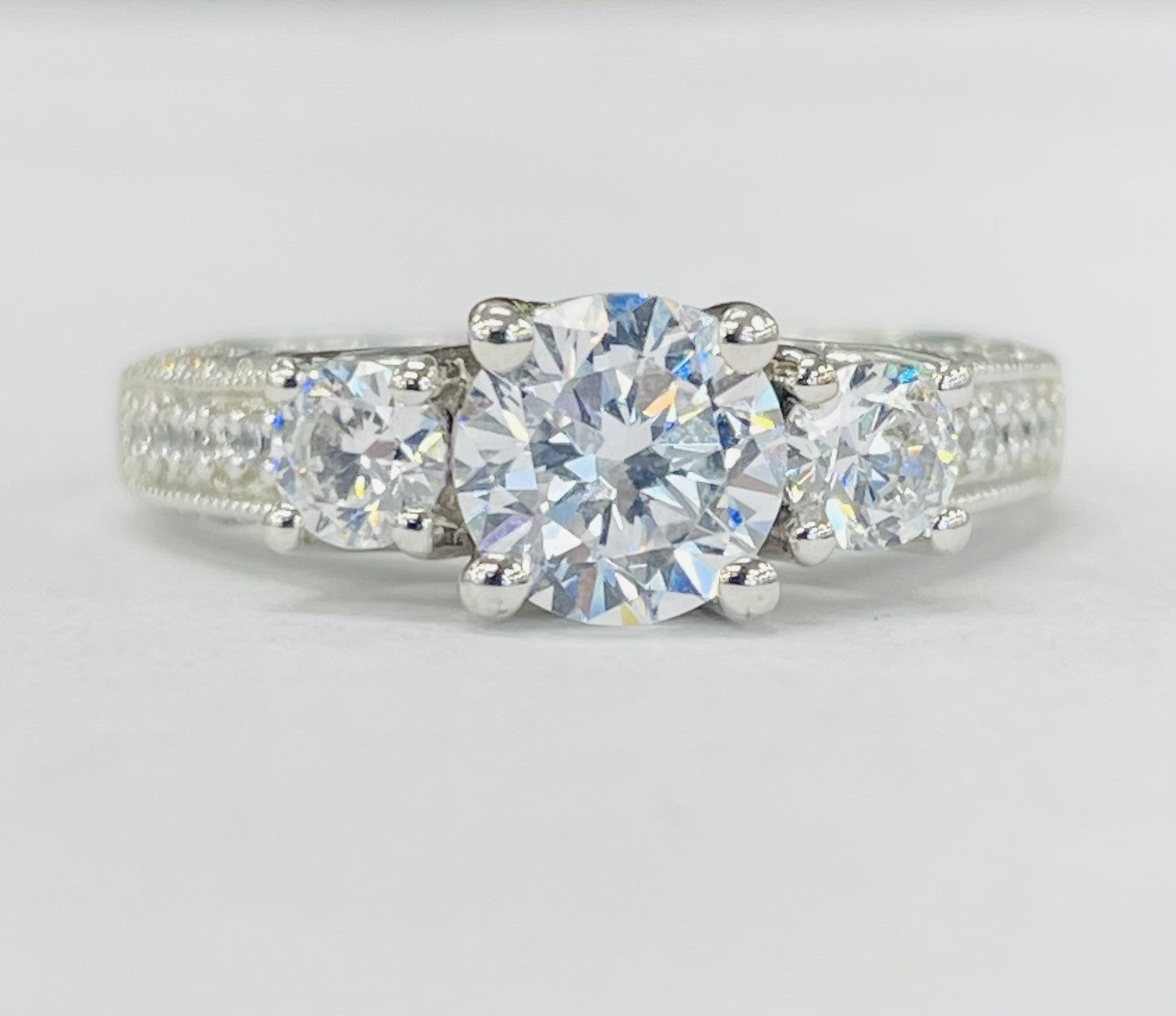 This three stone diamond setting features beautiful pave set diamond accents. Made to be seen and sparkle from every angle this ring is made with sparkle and design in mind.